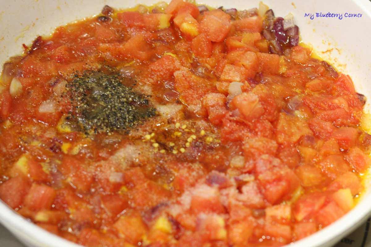 Makaron ugotować według przepisu na opakowaniu. Na dużej patelni z 1 łyżką oliwy z oliwek podsmażyć cebulę, dodać pokrojone pomidory.