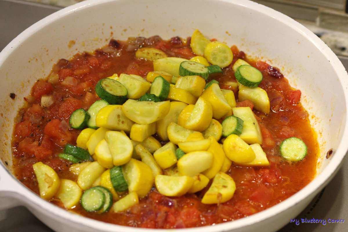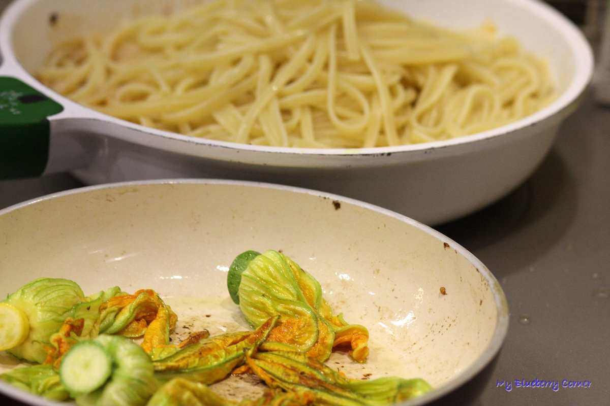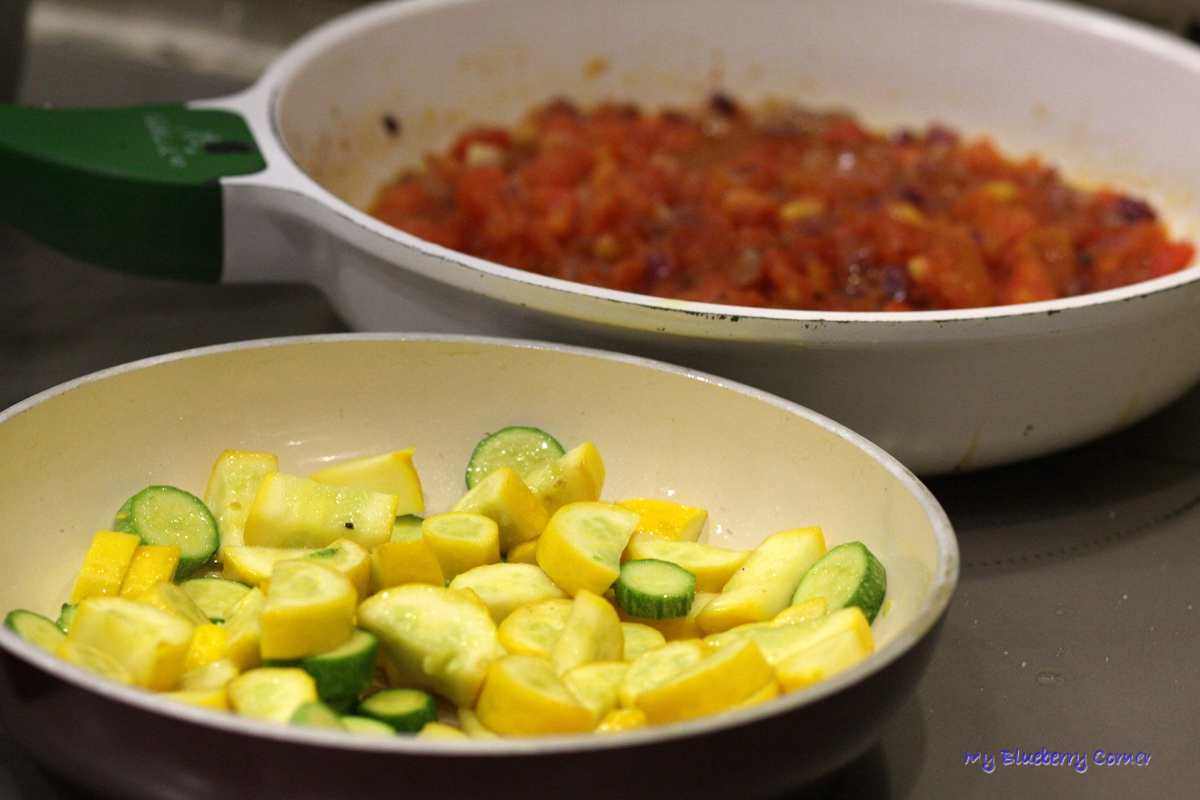 Posolić, popieprzyć, dodać peperoncino. Na drugiej mniejszej patelni, na 1 łyżce oliwy z oliwek podsmażyć pokrojone cukinie.