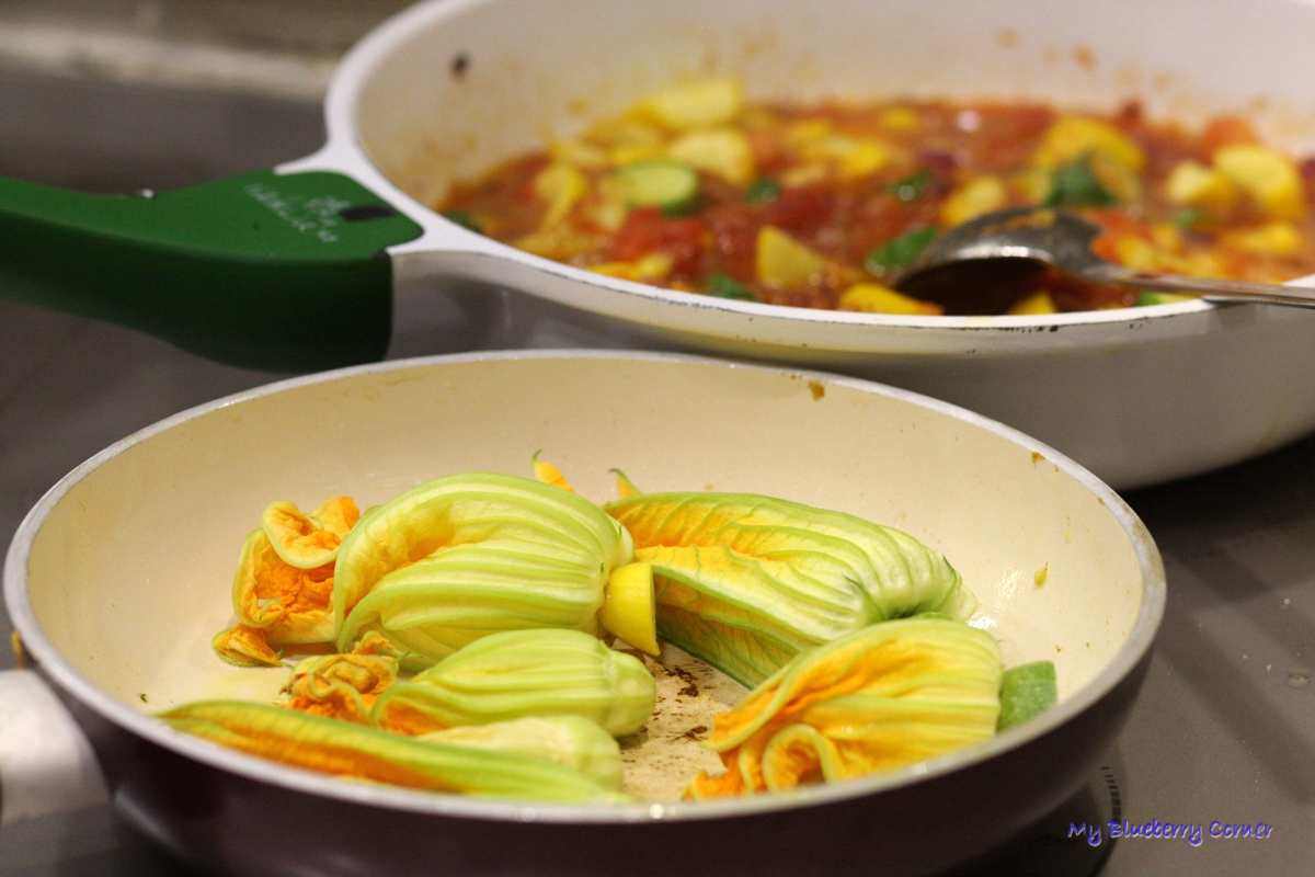 Przełożyć je na dużą patelnię, a na mniejszej patelni podsmażyć kwiaty.