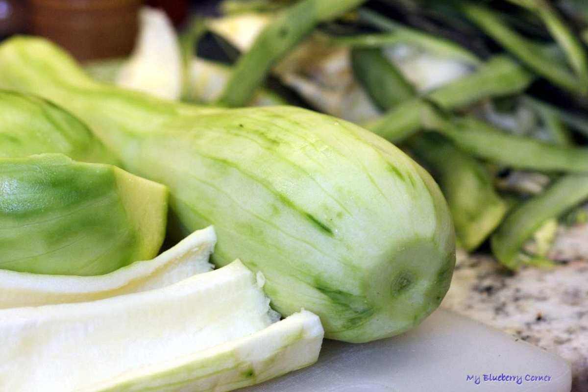 Kabaczki obrać ze skóry, przepołowić, wydrążyć gniazda nasienne (u mnie zostało 1200 g miąższu z kabaczka), cukinię tylko umyć.