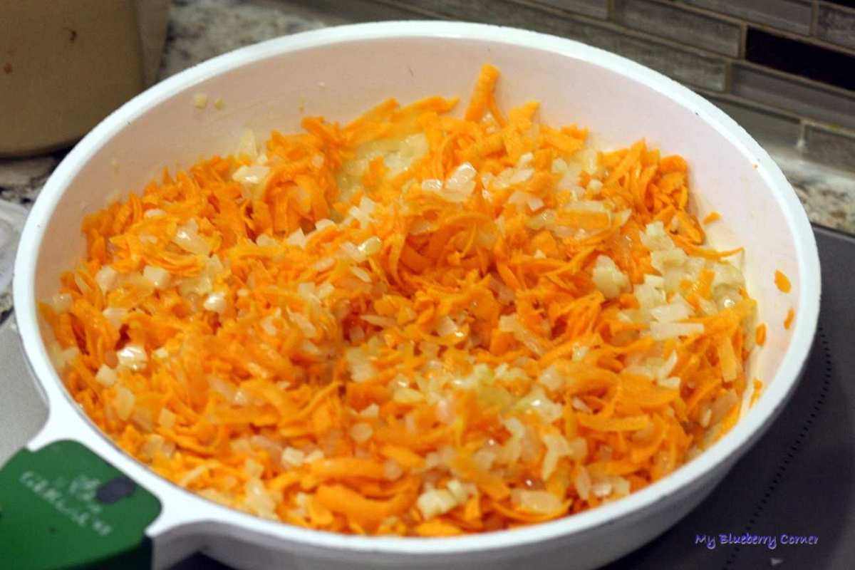 Cebule i czosnek obrać, pokroić w drobną kostkę. Marchewki obrać, zetrzeć na tarce o dużych oczkach. Na patelni rozpuścić całe masło. Zeszklić cebulę, dodać czosnek i startą marchewkę i dusić na małym ogniu przez około 10 minut.