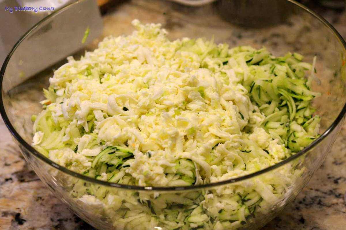 Kabaczka i mozzarellę zetrzeć na tarce o dużych oczkach. Jeśli mamy cukinie po starciu na tarce o dużych oczkach, przełożyć na sito i odstawić na 20 minut, do odcieknięcia.
