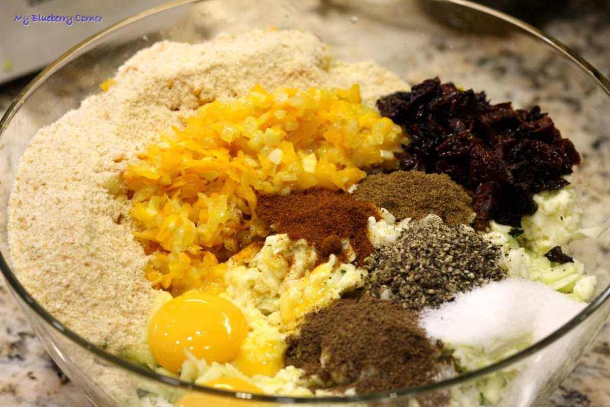 Dodać przestudzone warzywa z patelni razem z tłuszczem, bułkę tartą, jajka i wszystkie przyprawy. Suszone pomidory pokroić na mniejsze kawałki i dodać wraz z oliwą z oliwek do warzyw i wymieszać.