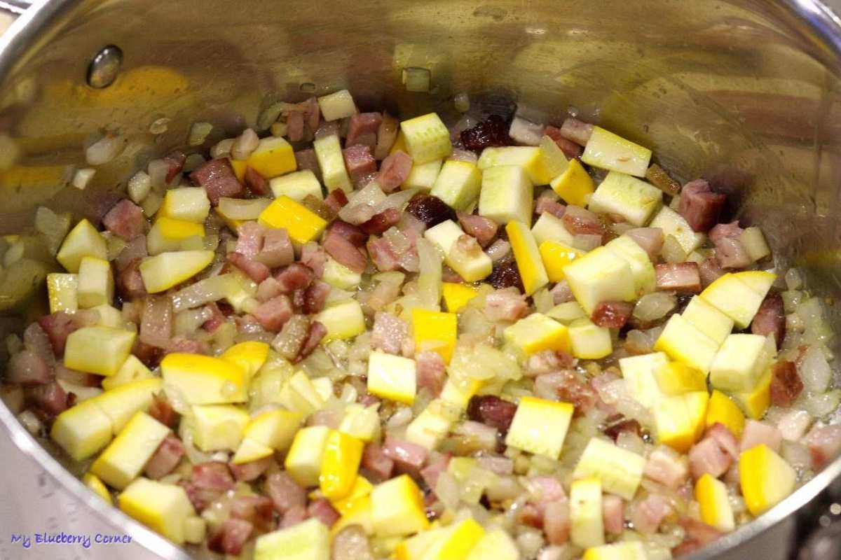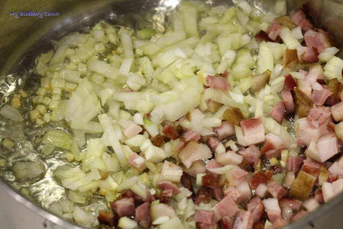 Czosnek i cebulę obrać i posiekać w drobną kostkę. Boczek, cukinię i pomidory pokroić w grubszą kostkę. W sporym garnku rozgrzać oliwę z oliwek. Wrzucić czosnek i lekko przesmażyć. Dodać cebulę, boczek i po chwili cukinię.