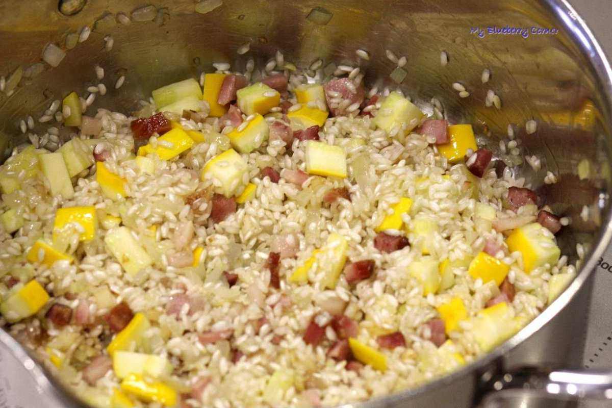 Po 5 minutach wsypać ryż i lekko przesmażyć.
