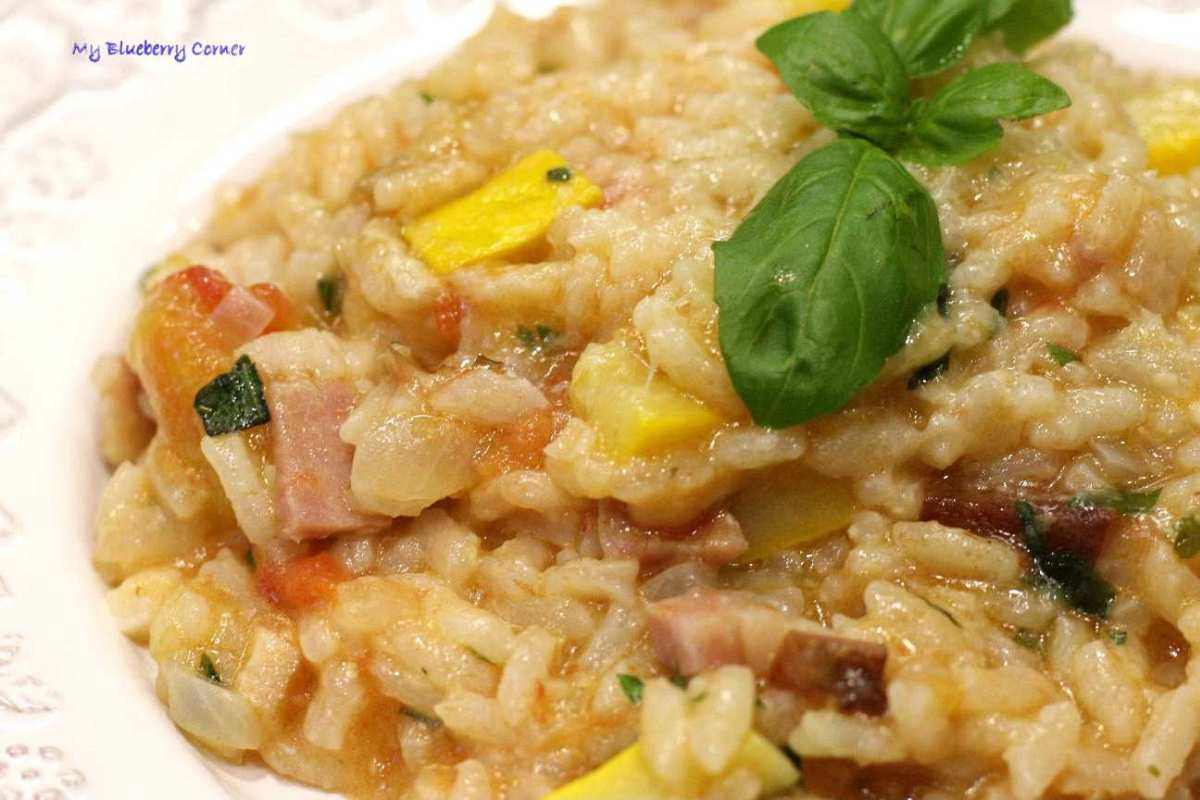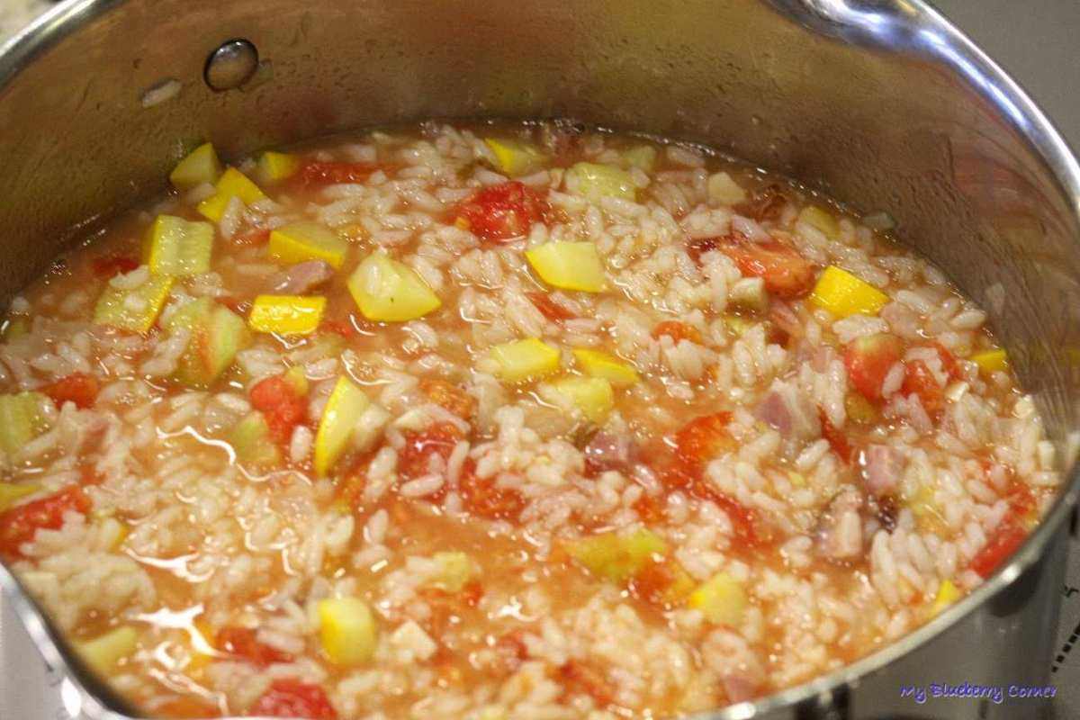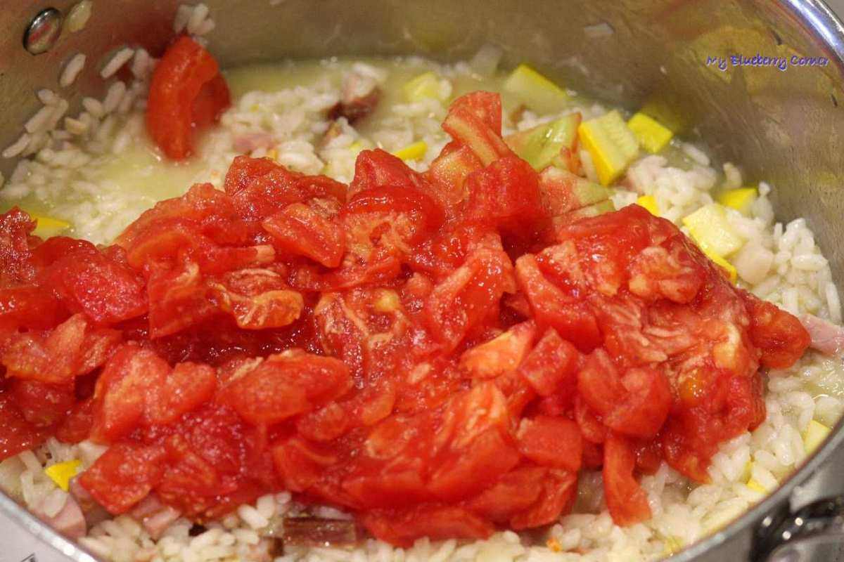 Wspaniałe, pełne smaku – pomidorowe risotto z cukinią. Wpadłam na ten pomysł z nadmiaru działkowych warzyw – pomidorów i cukinii. Najczęściej robię makarony po włosku, ale zachciało mi się czegoś innego. Risotto to pyszna potrawa, uwielbiam każdą jego wariację. O risotto trzeba wiedzieć jedną, bardzo ważną rzecz – musi być konsystencji lekko półpłynnej, nie może być suche. Do risotto należy używać specjalnego ryżu arborio lub carnaroli o wysokiej zawartości skrobi, tego typu ziarna mają zdolność do wchłaniania płynów i uwalniania skrobi, dlatego ryż staje się kleisty.