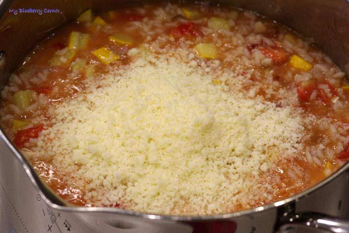 Pomidorowe risotto z cukinią jeść na gorąco, posypane odrobiną startego sera.