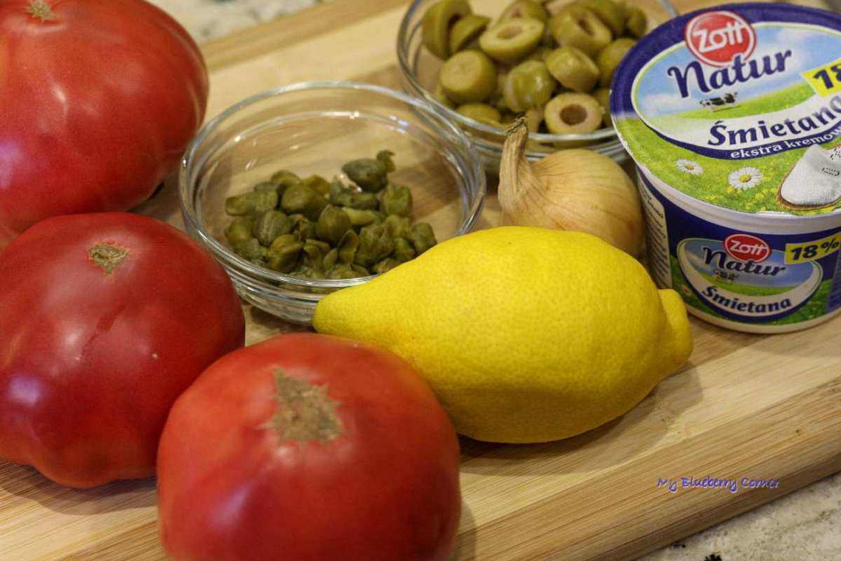 Smażone, czerwone pomidory podawać na gorąco z oliwkowo-kaparowym dipem.