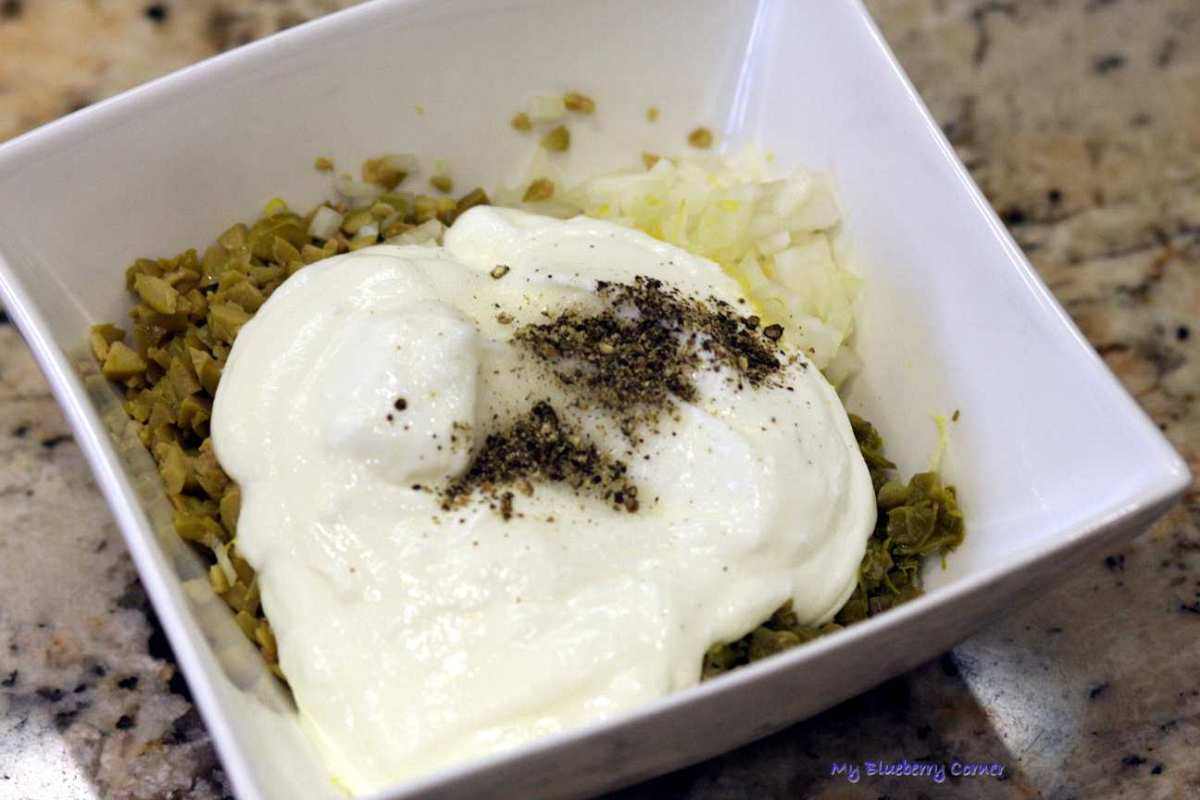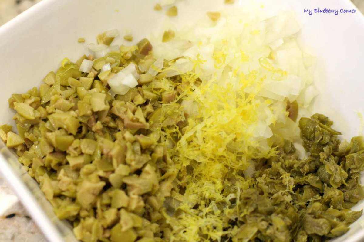 Cebulę obrać i drobno posiekać razem z kaparami i oliwkami. Dodać startą skórkę z cytryny i śmietanę (lub jogurt).