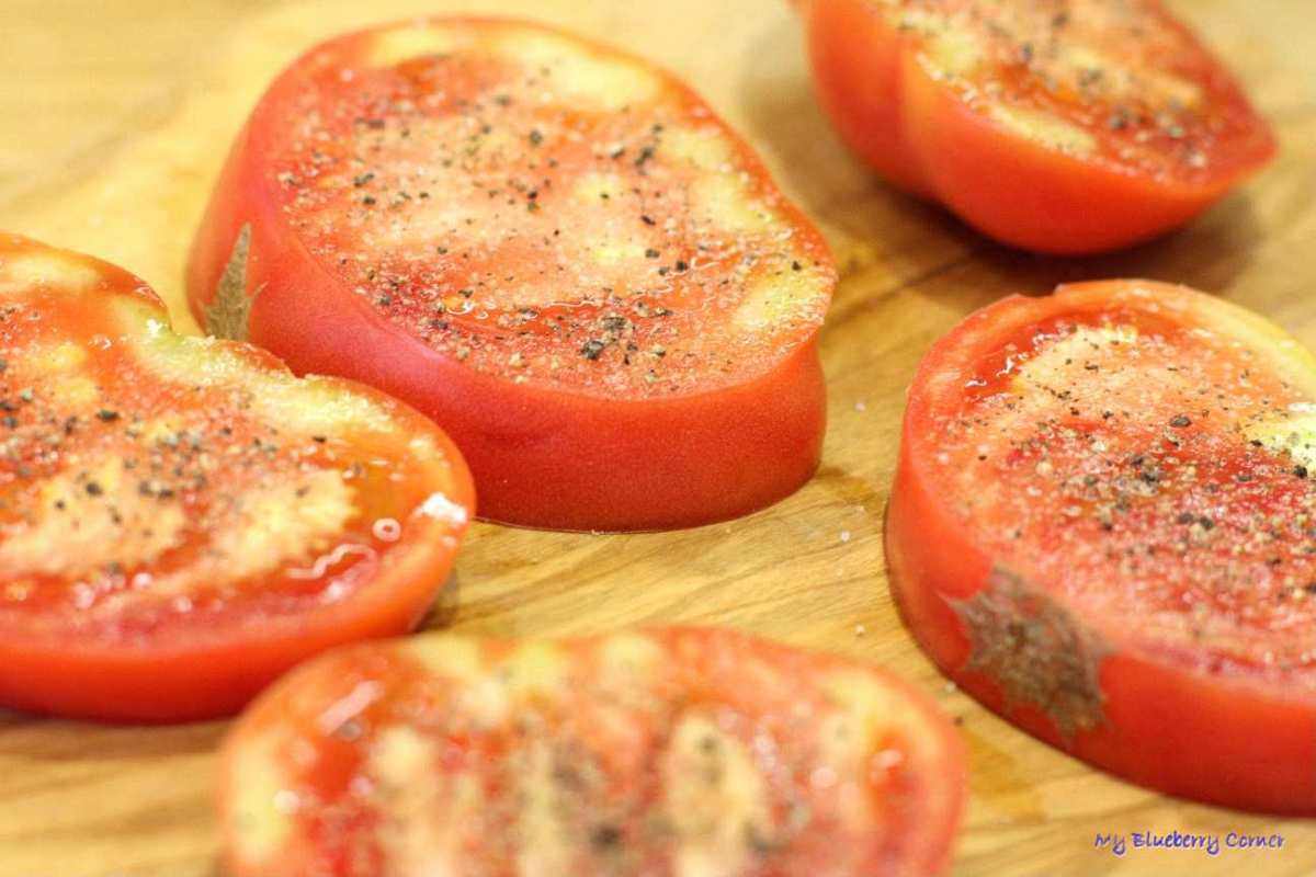 Pomidory umyć (można obrać ze skóry), wydrążyć twarde środki i pokroić na grube plastry (ok. 1 cm). Solidnie przyprawić solą i pieprzem.