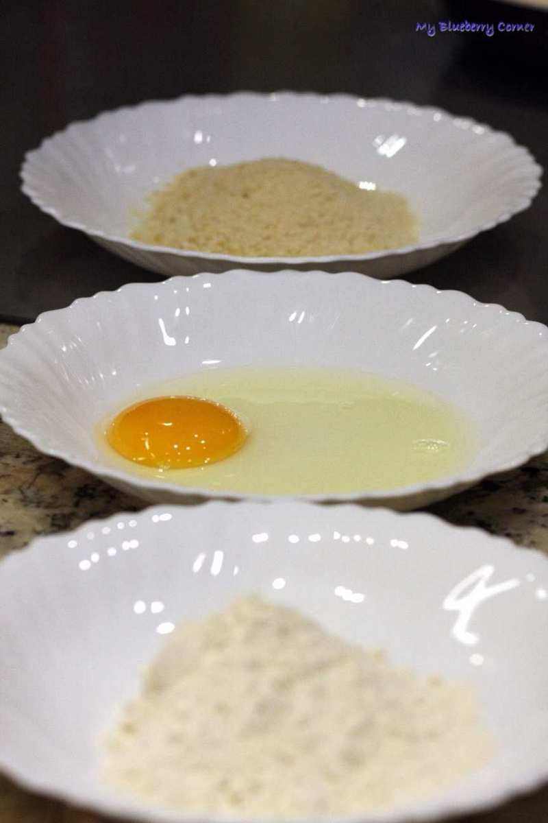Przygotować 3 głębokie talerze. Na jednym talerzu wysypać mąkę, na drugim wybić jajko i zmieszać je widelcem, na trzecim wyspać bułkę tartą.