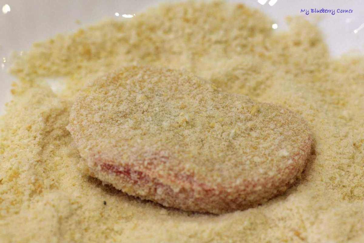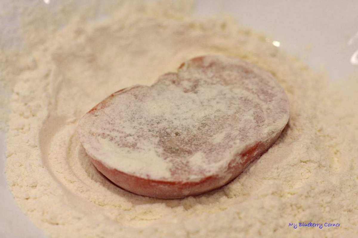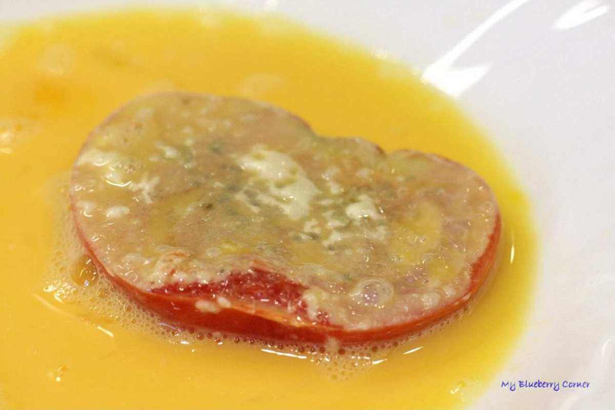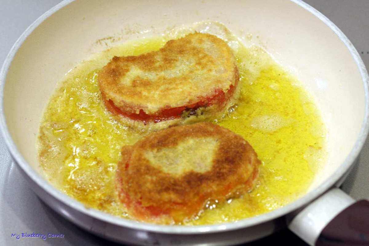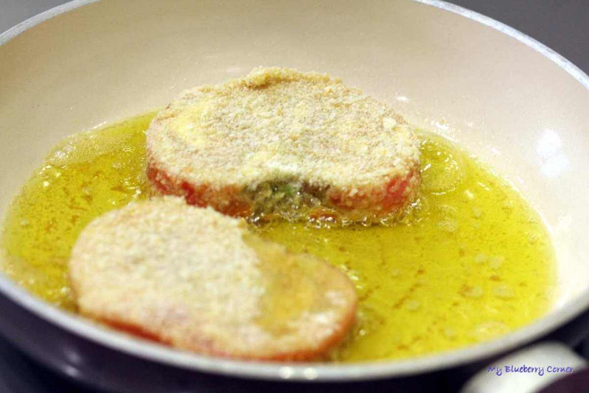 Patelnię rozgrzać z oliwą z oliwek. Każdy plaster pomidora obtoczyć najpierw w mące, potem zanurzyć w rozkłóconym jajku, na końcu obtoczyć w bułce tartej.