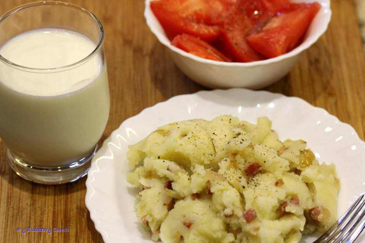 Ziemniaki ze skwarkami i cebulką – prosty, wiejski, letni obiad. Do tego obowiązkowym dodatkiem jest sałatka z pomidorów i szklanka zsiadłego mleka, maślanki albo kefiru. Danie proste, pożywne i bardzo smaczne.