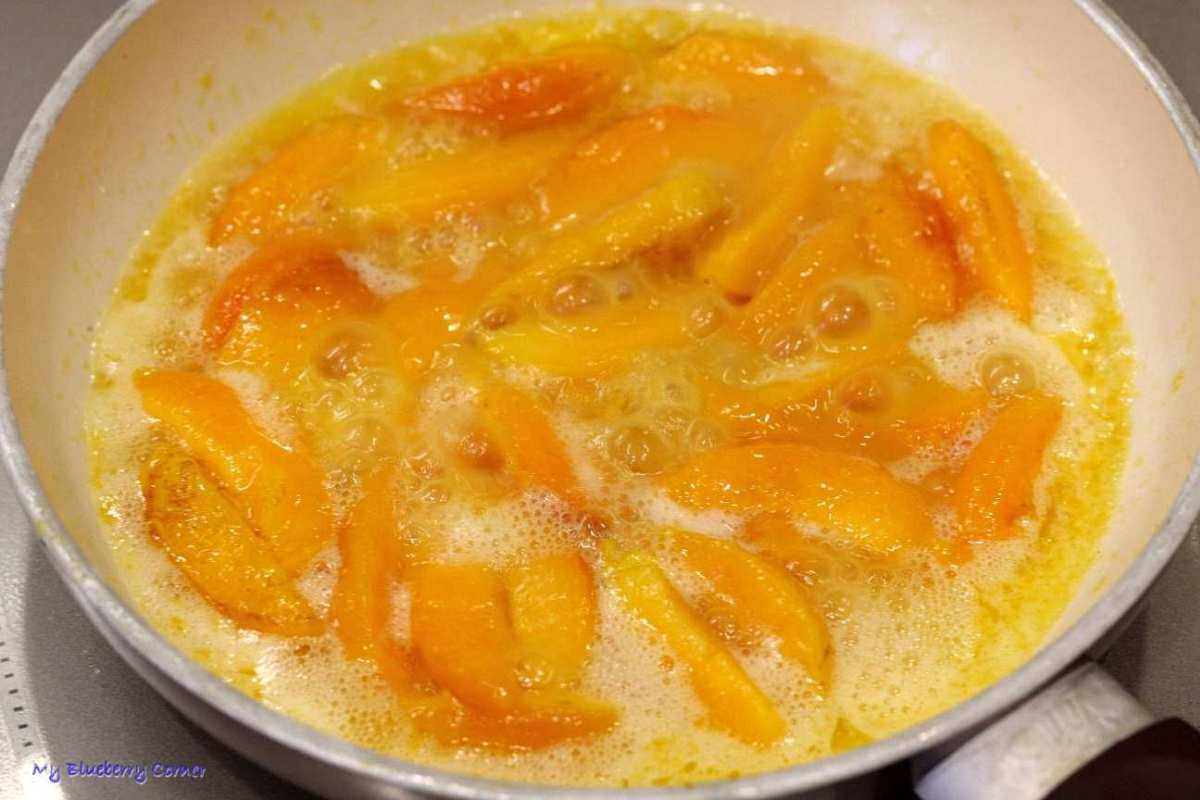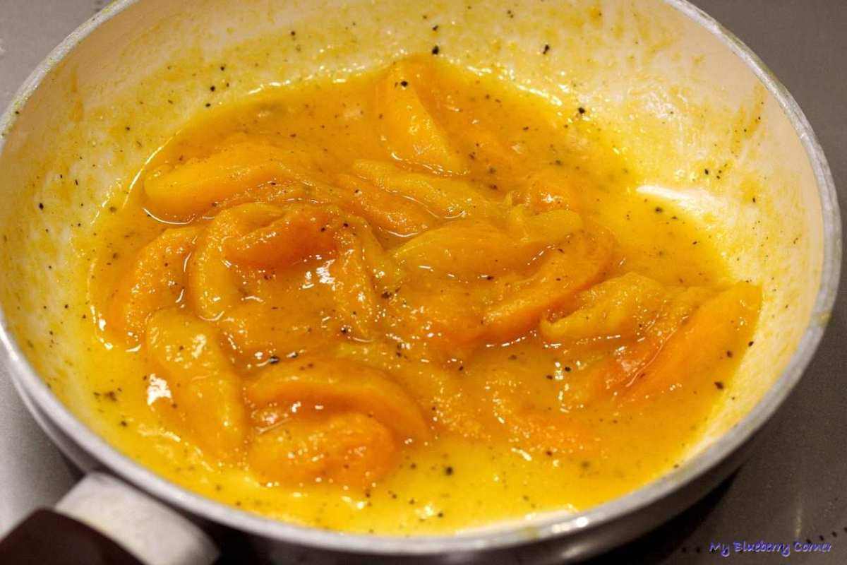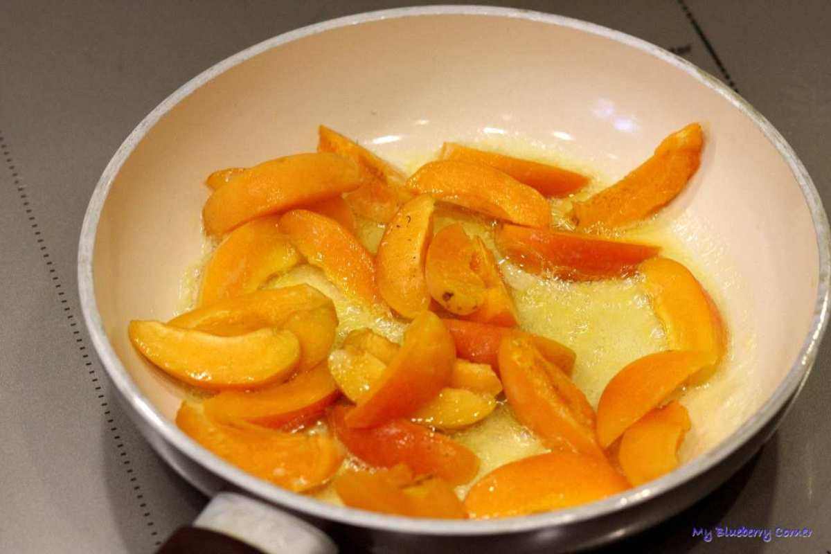 Na patelni rozgrzać masło, wrzucić morele i chwilkę podsmażyć.