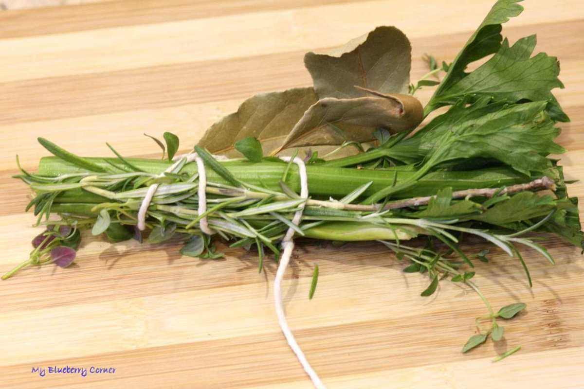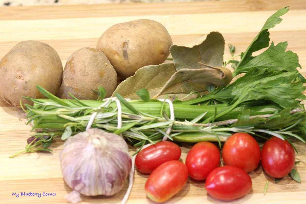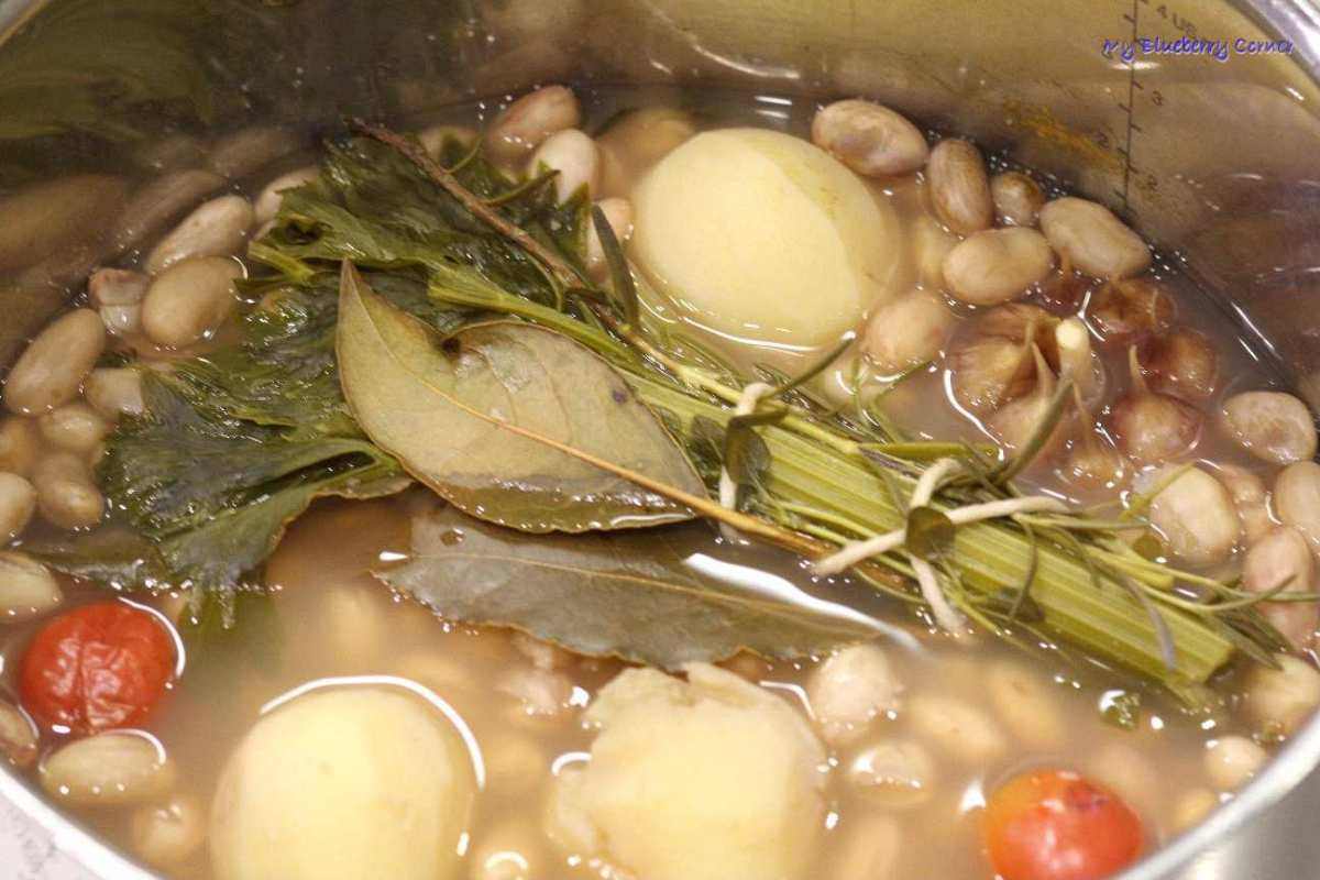 Ziemniaki obrać, dodać do fasoli razem z główką czosnku i pomidorami. Rozmaryn, tymianek, łodygę selera naciowego i liście laurowe związać razem sznurkiem (bouquet garni) i wrzucić do garnka.