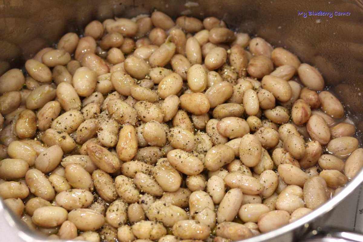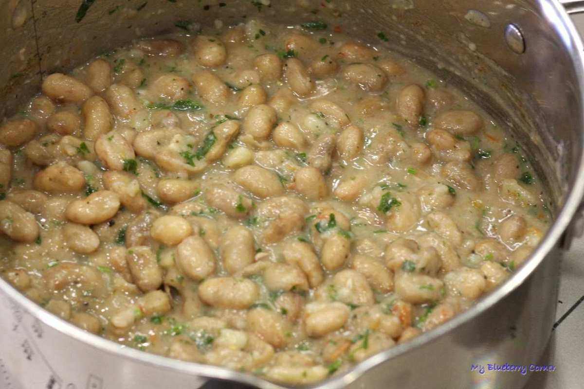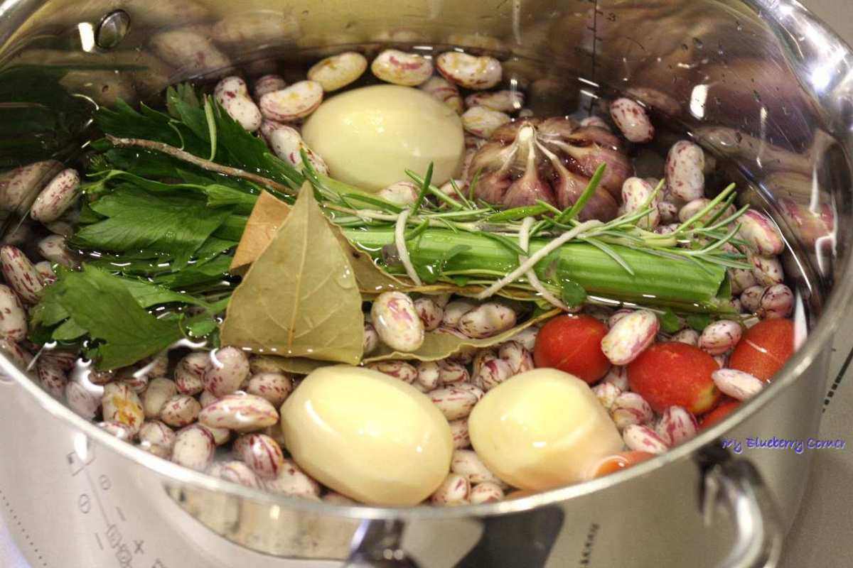 Gotowana fasola po włosku – z ziołami, ziemniakami, czosnkiem – pyszna, sycąca przekąska. Fasola borlotti to bardzo smaczna fasola. Nazywana też jest rzymską fasolą lub fasolą żurawinową. Bardzo popularna we Włoszech. Właśnie tam kupiłam nasiona tej fasoli (podczas zeszłorocznych wakacji) a w tym roku posadziłam je na działce. Wyrosły piękne, kolorowe strąki, które wykorzystałam w tej potrawie.