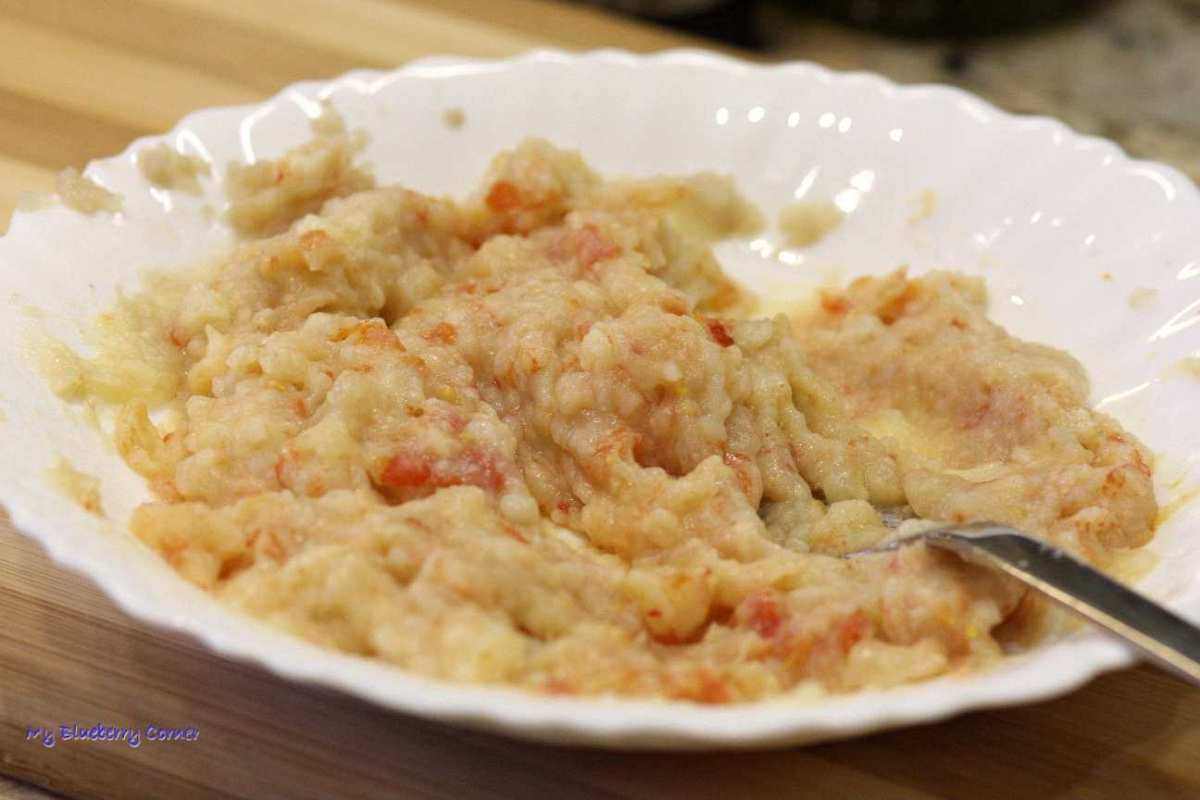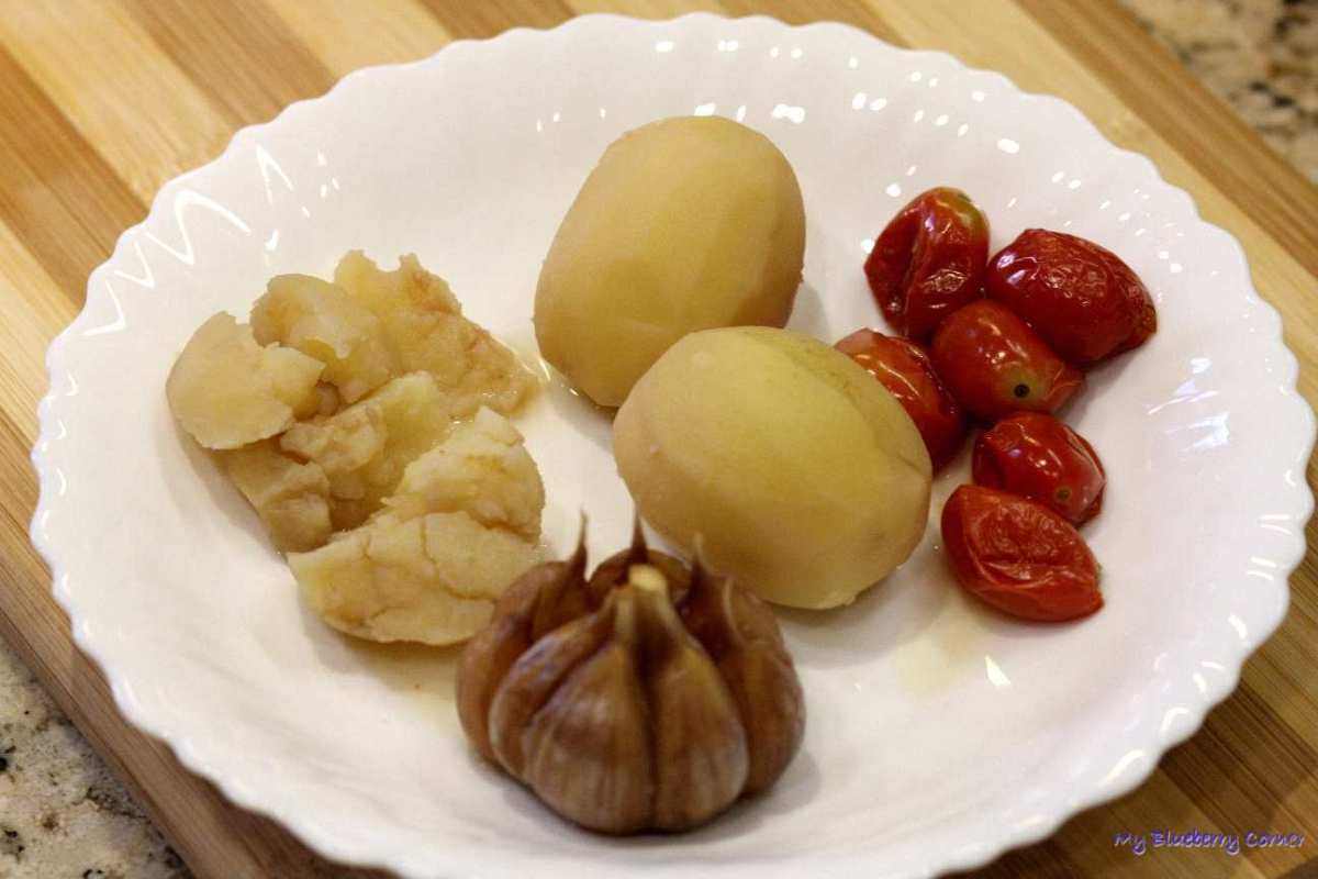 Czosnek wycisnąć z łupin (łupiny wyrzucić), pomidorki obrać ze skórek (skórki wyrzucić), wszystko rozgnieść widelcem na papkę.