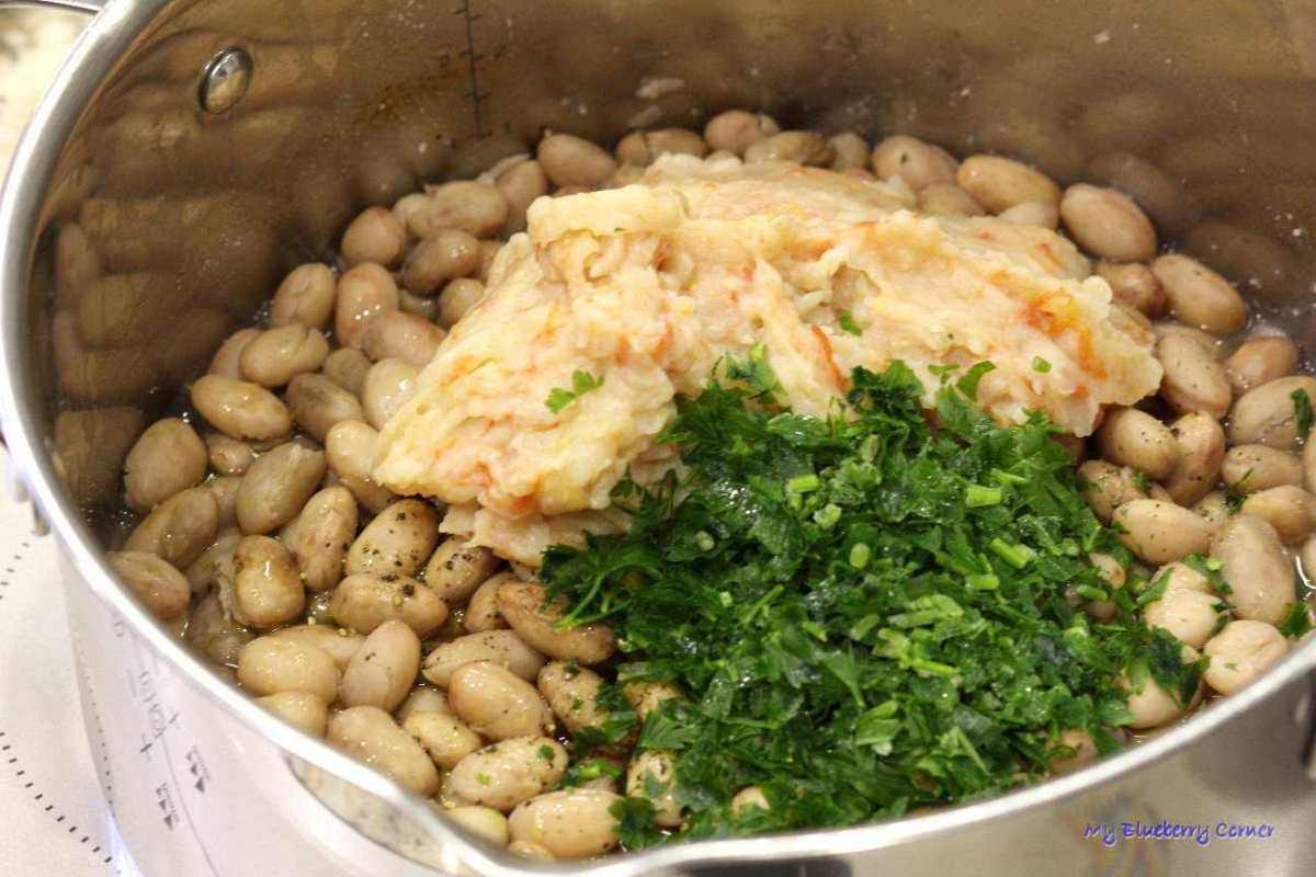 Natkę drobno posiekać i razem z rozgniecionymi warzywami dodać do fasoli, zamieszać.