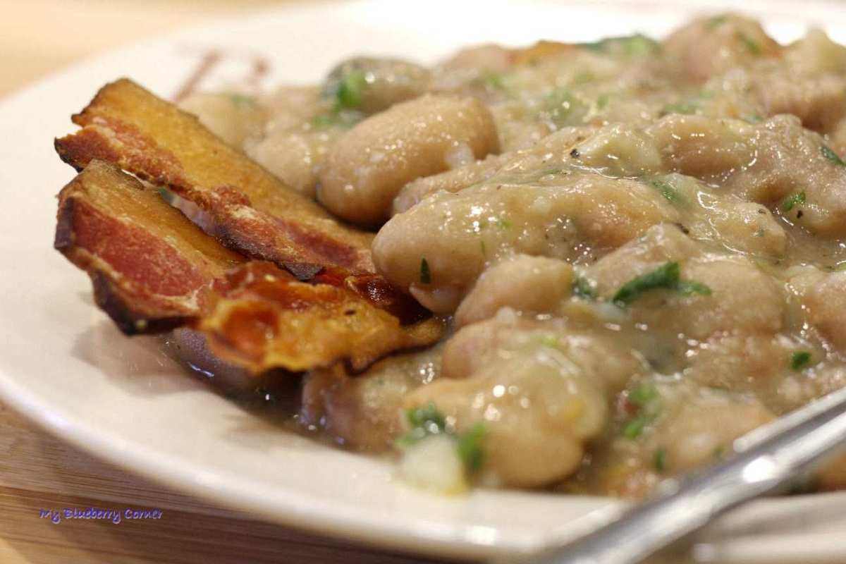 Gotowana fasola po włosku powinna być podawana z boczkowymi chipsami albo na grzankach z chleba.