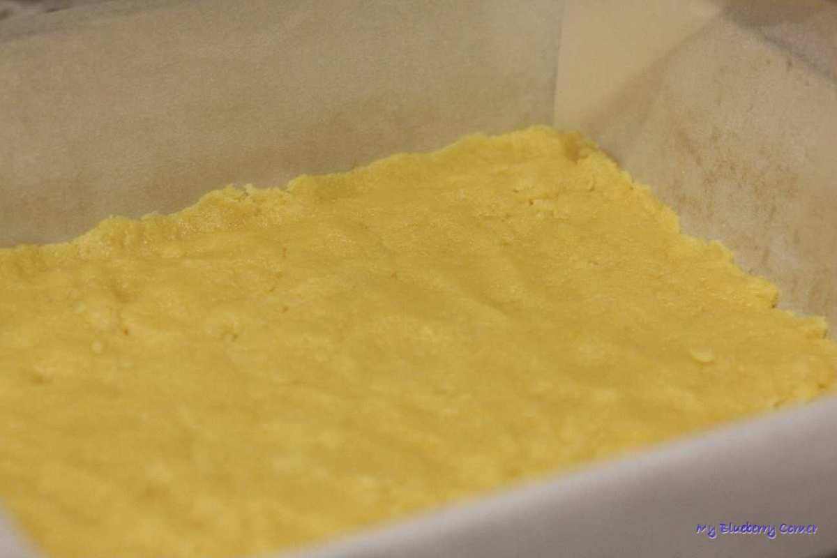Formę do pieczenia wyłożyć papierem do pieczenia, dno formy wylepić ciastem.