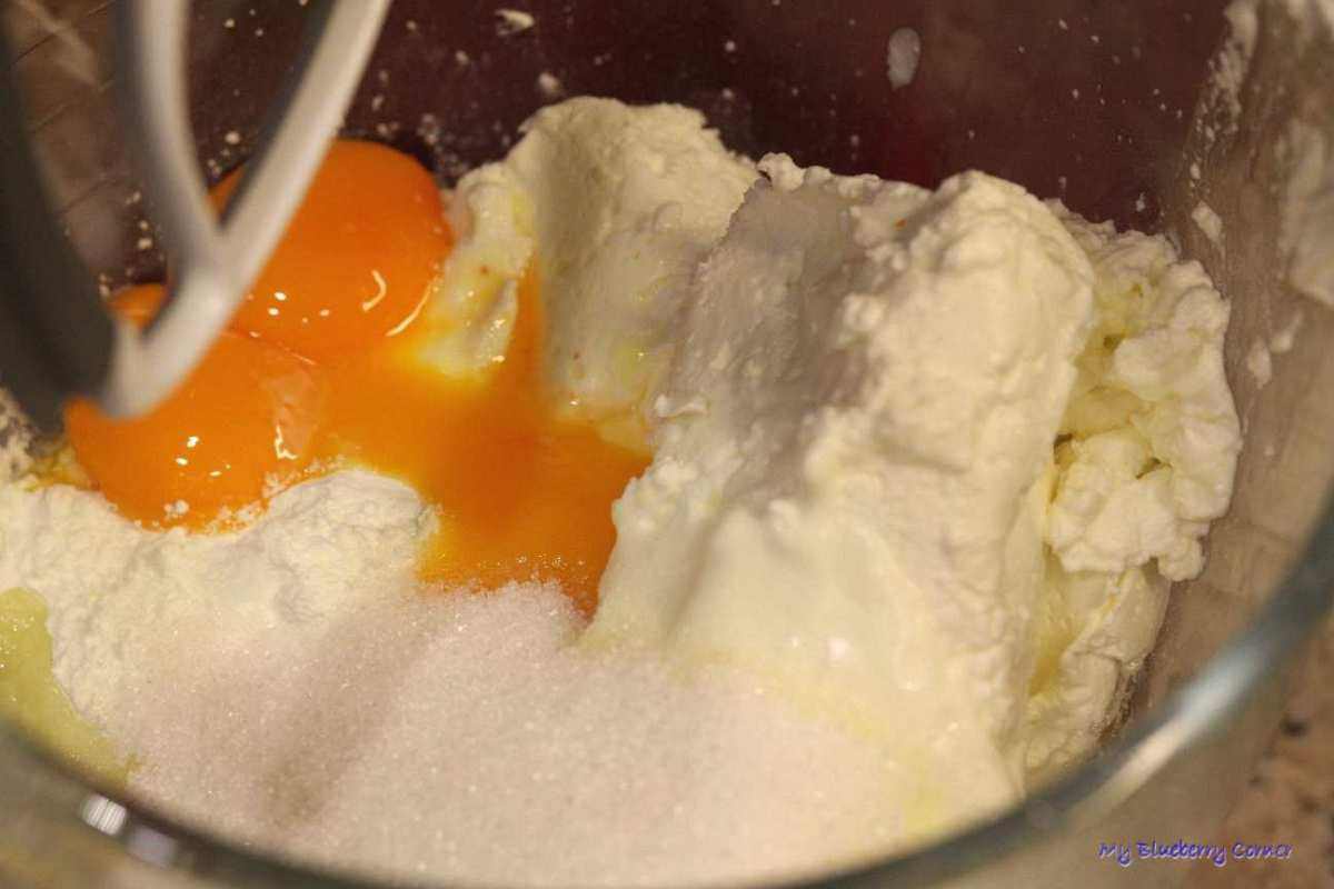 W drugiej misce umieścić twaróg, budynie, śmietanę, olej, cukier, żółtka i mleko i szybko wymieszać.