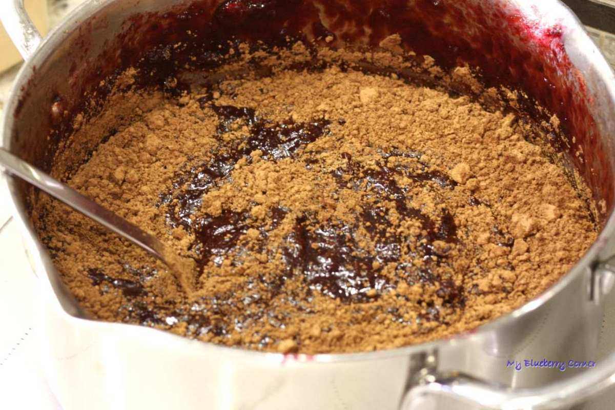 Śliwki należy często mieszać, żeby nie przywarły do dna i się nie przypaliły. Gdy śliwki zamienią się w powidła i zgęstnieją odpowiednio trzeba do nich dodać kakao.