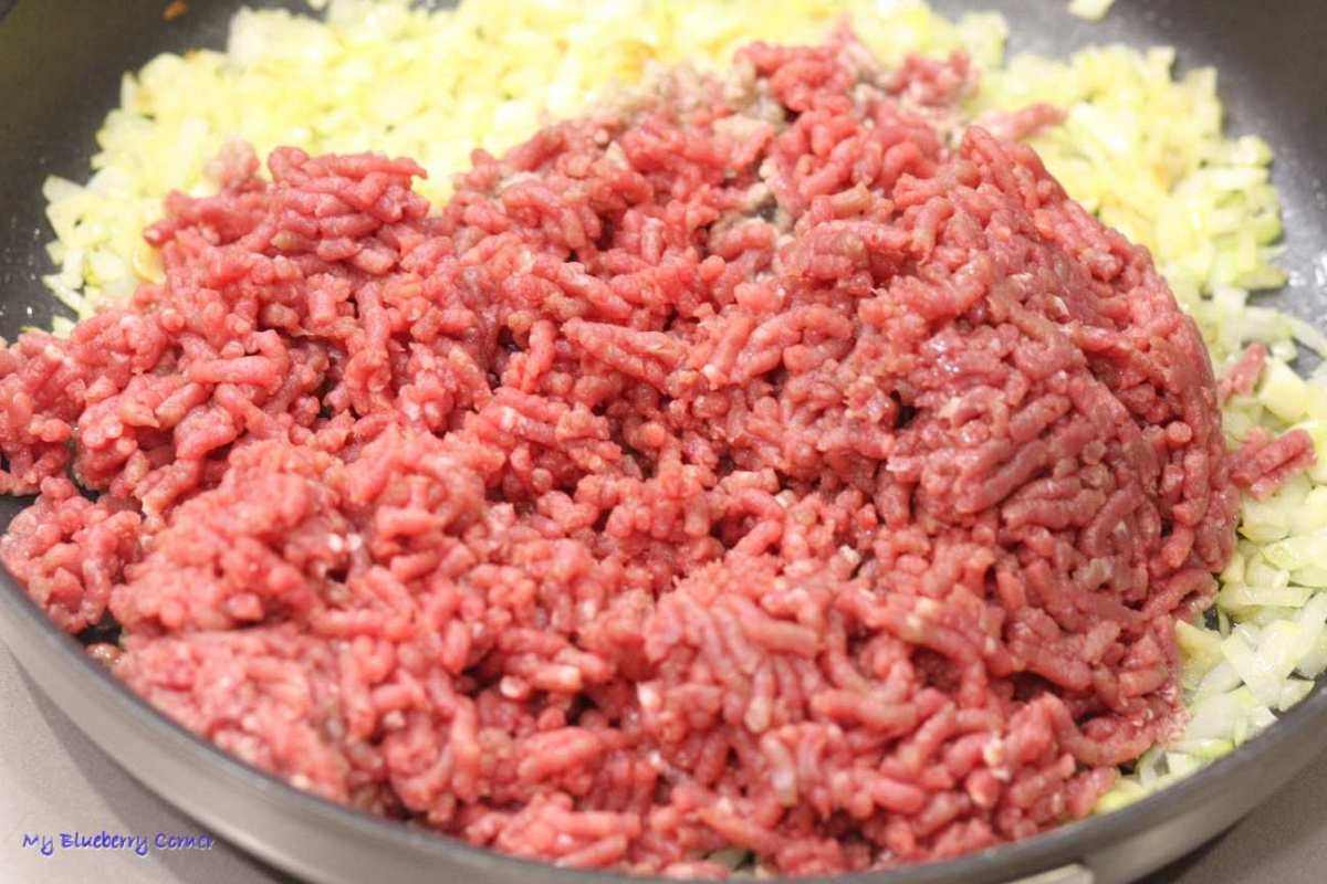 Czosnek i cebulę obrać, czosnek pokroić w cienkie plasterki, cebulę drobno posiekać. Na oliwie z oliwek podsmażyć czosnek, dodać cebulę. Po kilku minutach dodać wołowinę.