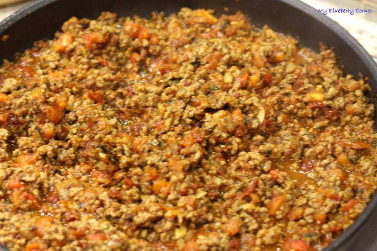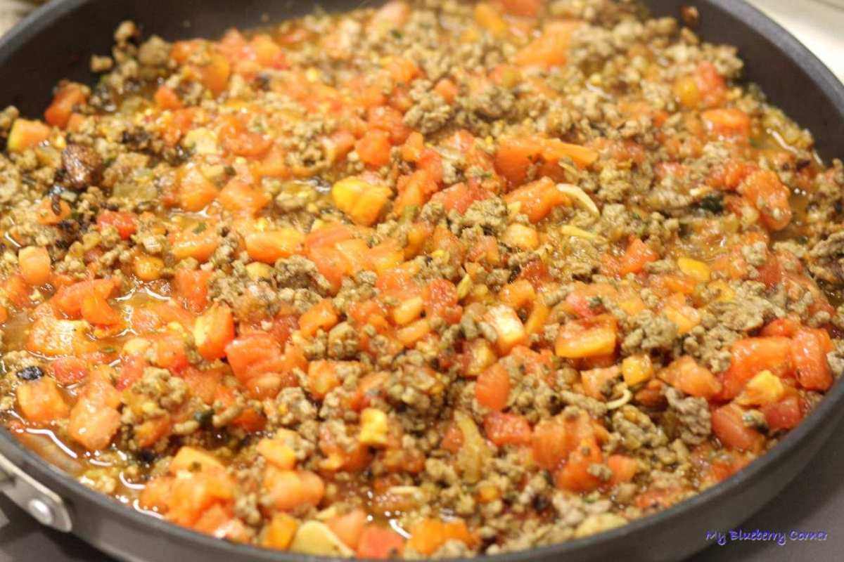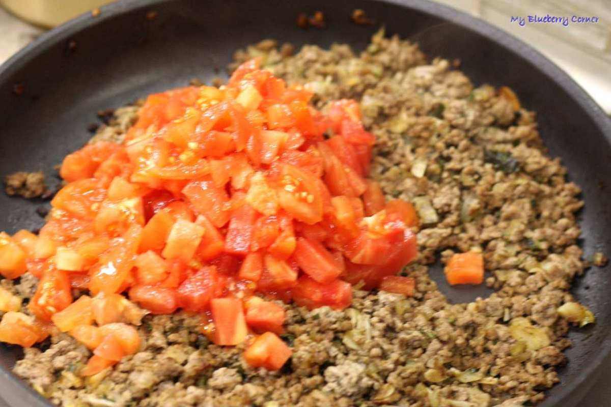 Pomidory sparzyć, obrać ze skóry i pokroić w kostkę, dodać do mięsa i dusić przez 8 minut.