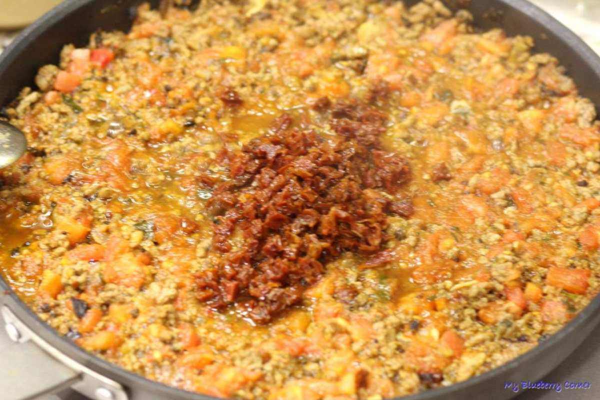 W tym czasie ugotować makaron spaghetti według przepisu z opakowania. Suszone pomidory również pokroić w kostkę i dodać na patelnię.