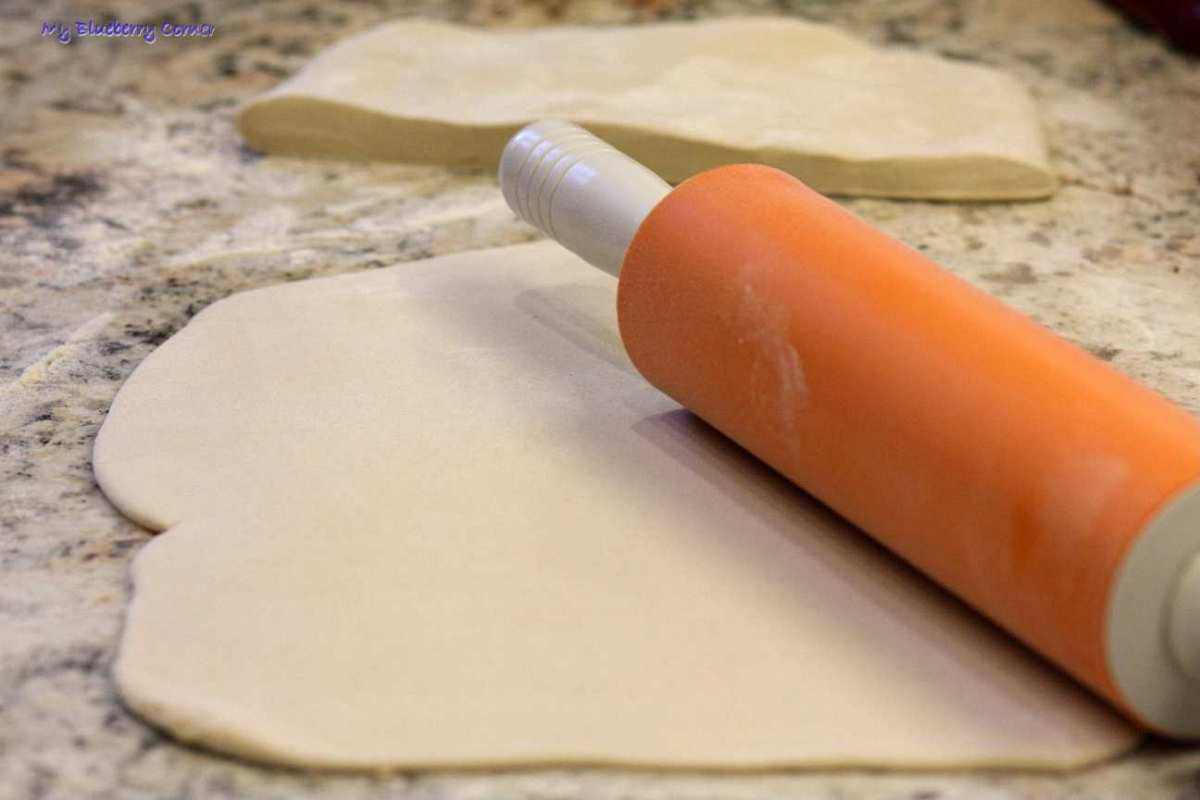 Ciasto podzielić na pół, rozwałkować placki na grubość ok. 2 mm.