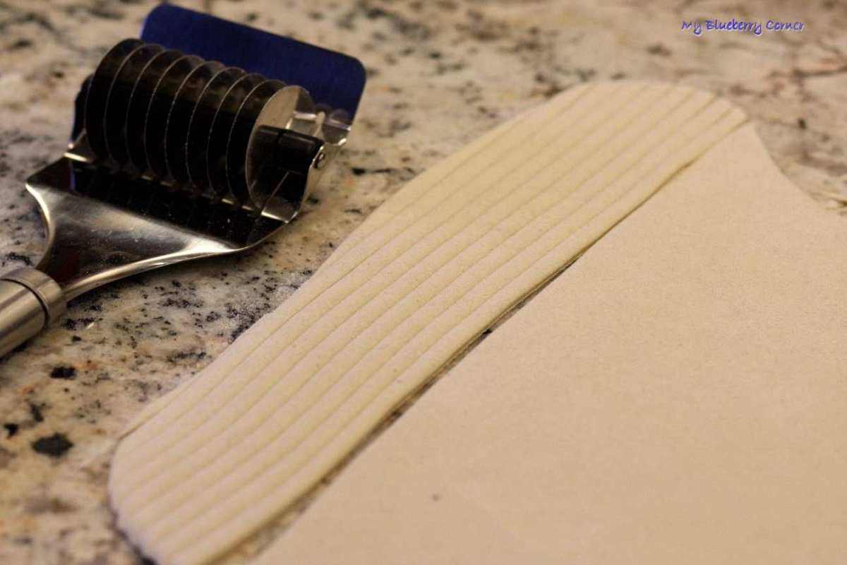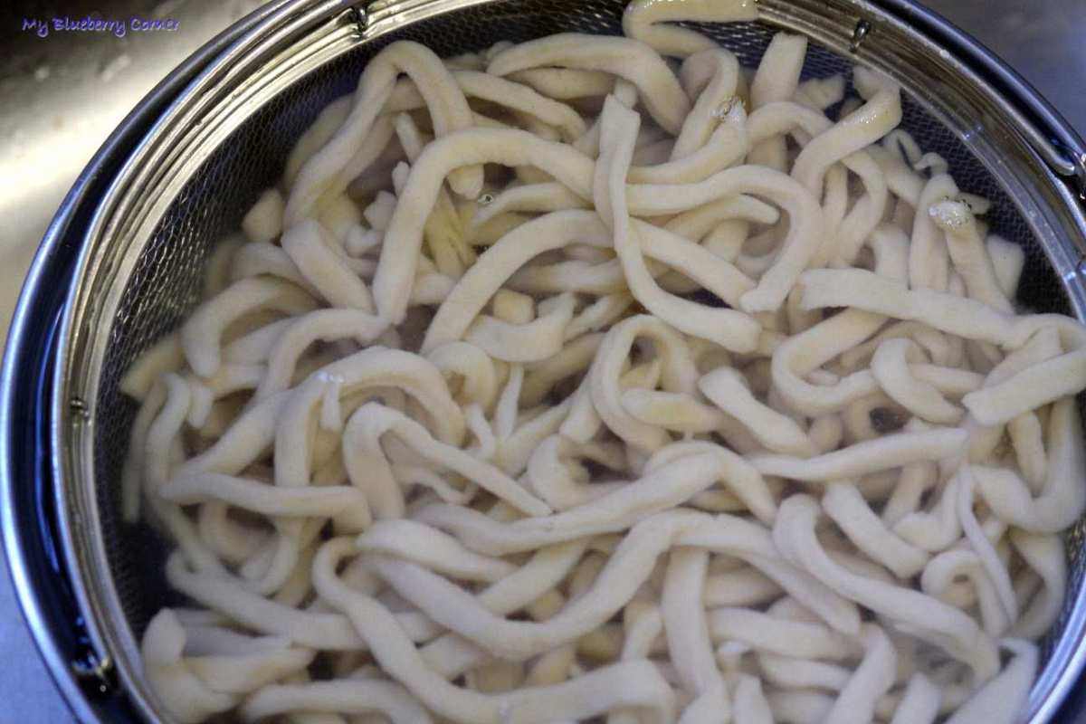 Placki pokroić w paski grubości 3-4 mm, przesypać mąką żeby się nie skleiły.