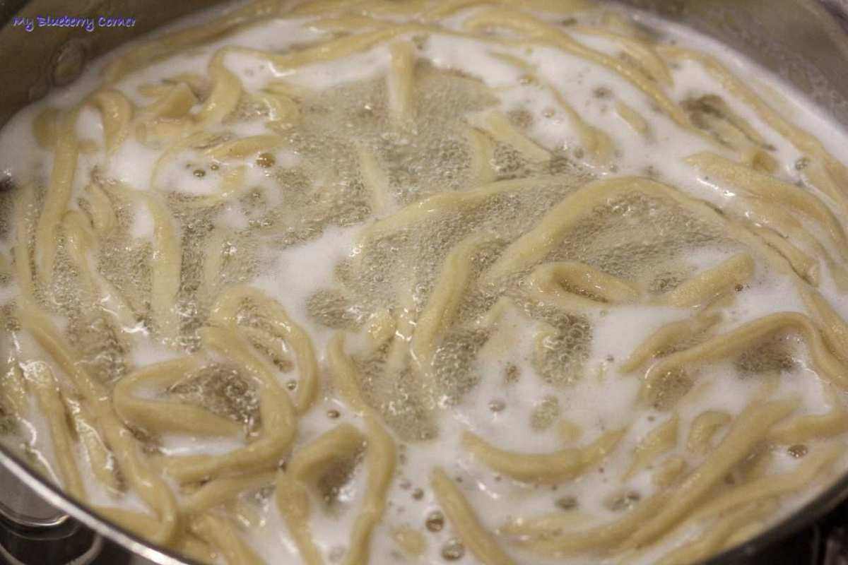 Makaron gotować we wrzącej wodzie przez 8 minut.
