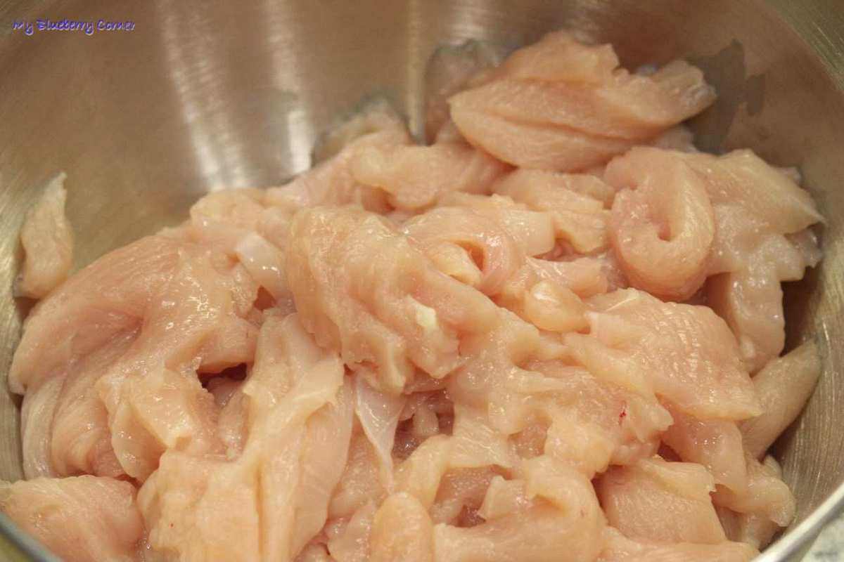 Papryczkę chili posiekać jak najdrobniej. Piersi kurczaka pokroić na cienkie paski.