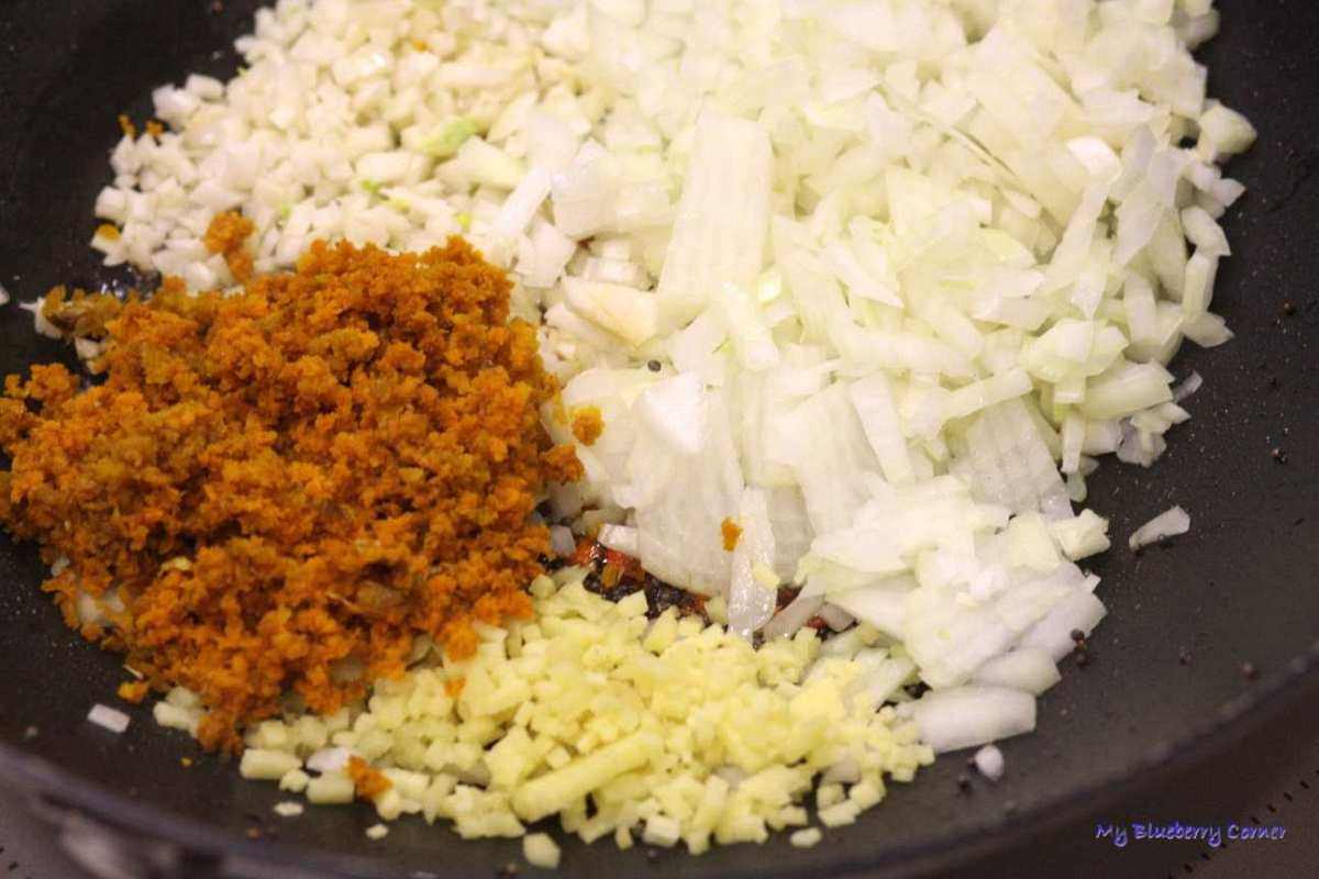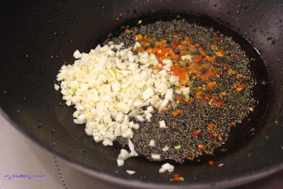 Na dużej patelni lub w woku rozgrzać masło klarowane, na tym pod pokrywką przesmażyć ziarnka gorczycy, aż zaczną podskakiwać i głośno pękać. Dodać cebulę, czosnek, imbir, kurkumę i papryczkę chili, zamieszać i smażyć przez ok. 5 minut.