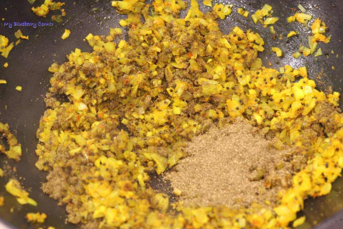 Dodać drugą łyżkę klarowanego masła i przyprawy w proszku, przesmażyć przez 2 minuty.