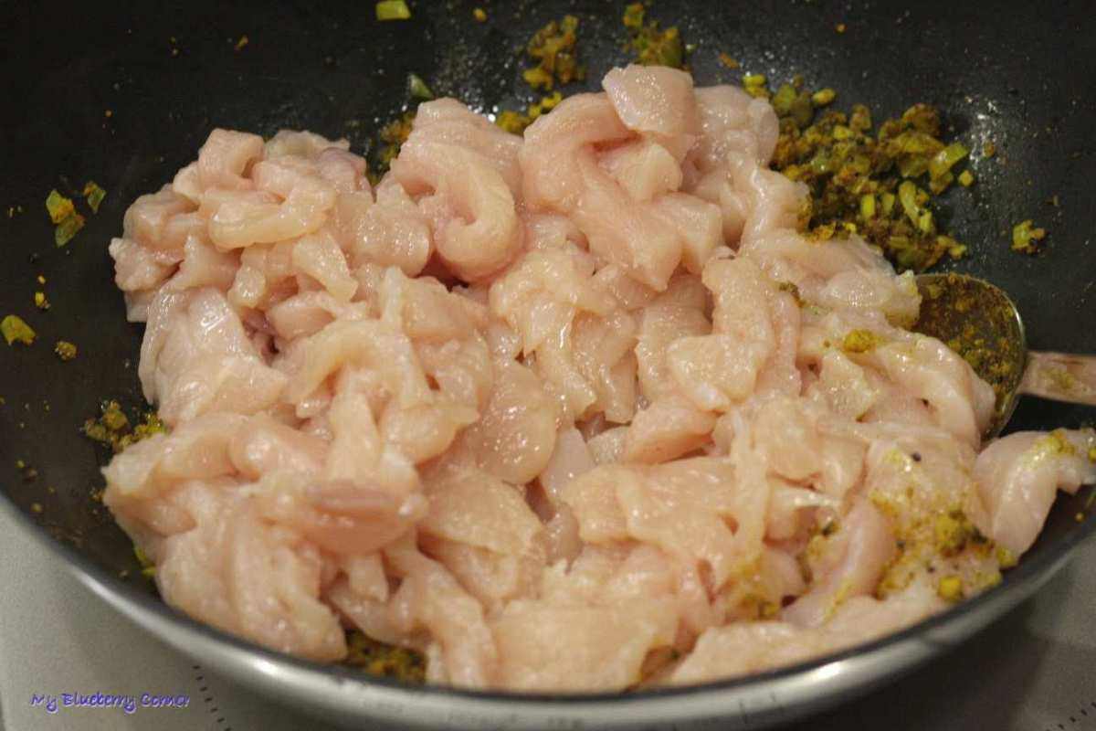 Zwiększyć temperaturę i dodać kawałki kurczaka.