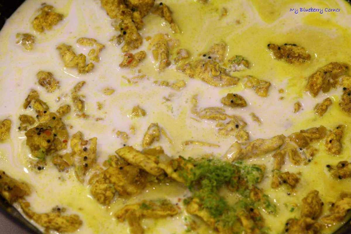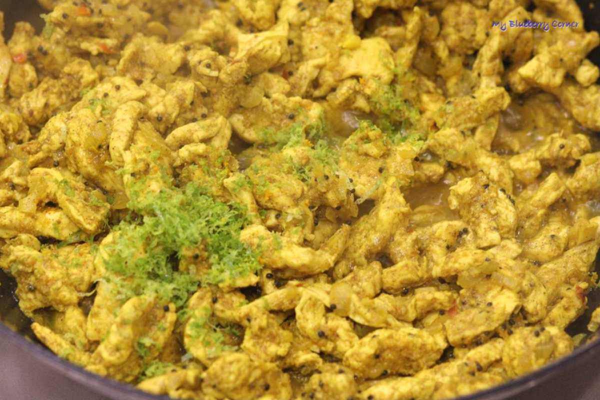 Gdy mięso kurczaka się usmaży ( nie musi być rumiane), dodać startą skórkę z limonki, sok z limonki, sos rybny, sos sojowy, cukier i mleko kokosowe.