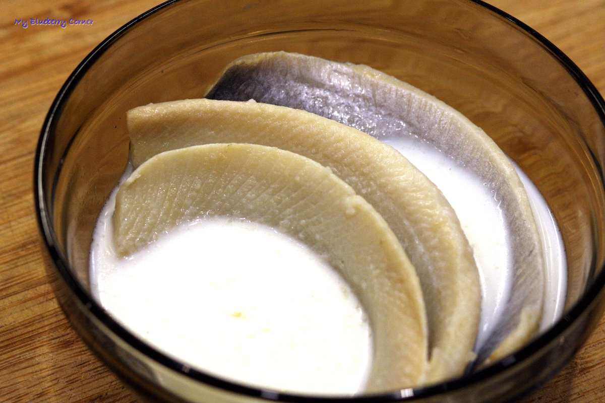 Solone śledzie namoczyć w mleku, odstawić na 1 godzinę.