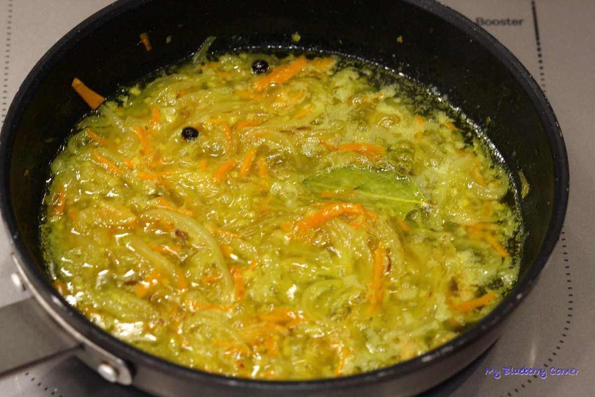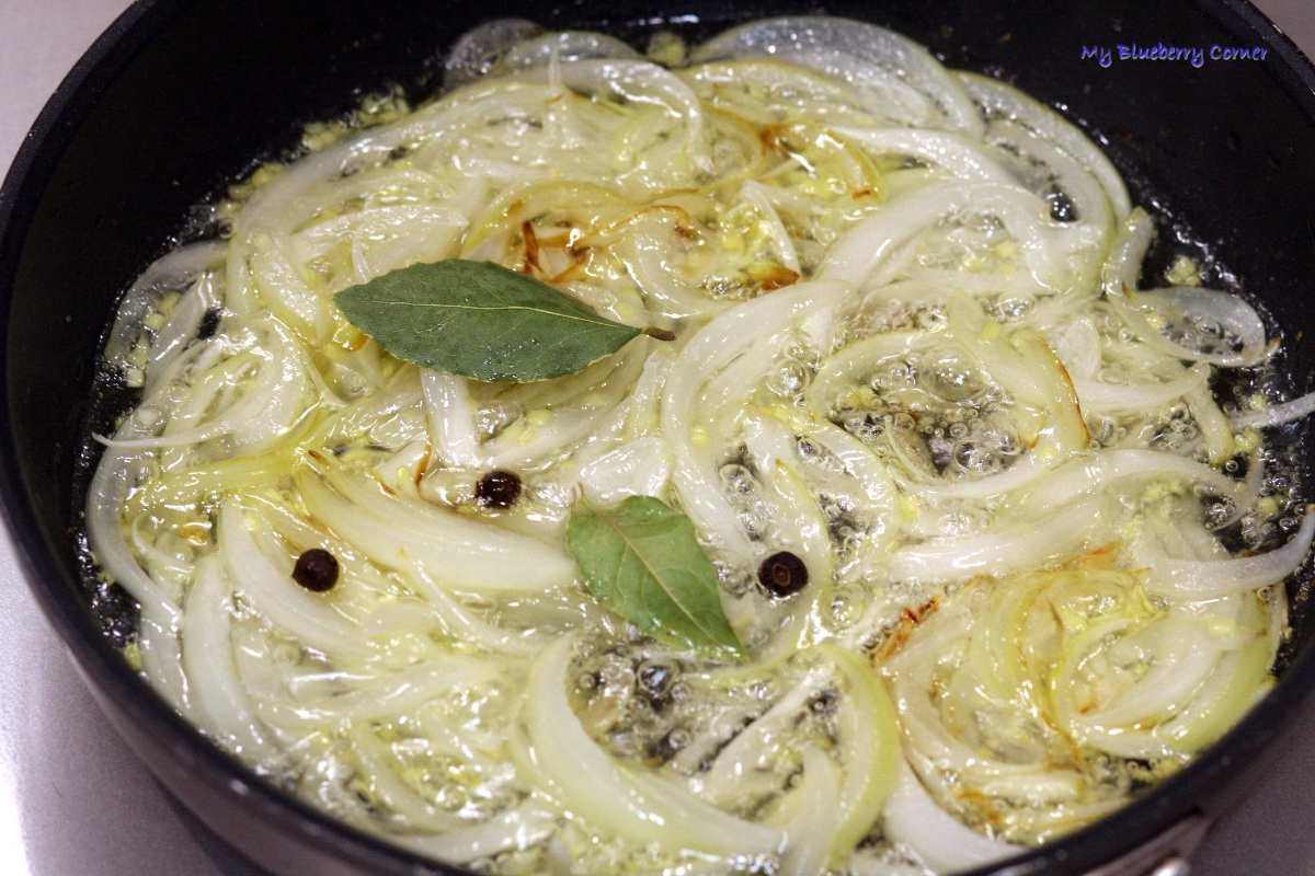 Po tym czasie śledzie wyjąć, osuszyć papierowym ręcznikiem i pokroić na 2 cm kawałki. Cebulę obrać i pokroić w piórka. Na patelni rozgrzać olej, dodać cebulę, zeszklić ją nie dopuszczając do zbrązowienia. Zmniejszyć temperaturę. Imbir obrać i pokroić w drobną kostkę dodać do cebuli oraz liście laurowe i ziele angielskie.