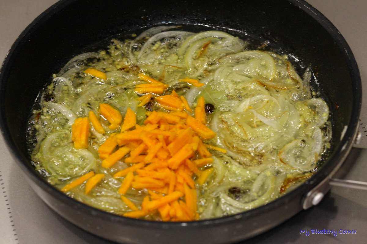 Kurkumę delikatnie oskrobać (używając gumowych rękawiczek) i pokroić w słupki, wrzucić na patelnię.