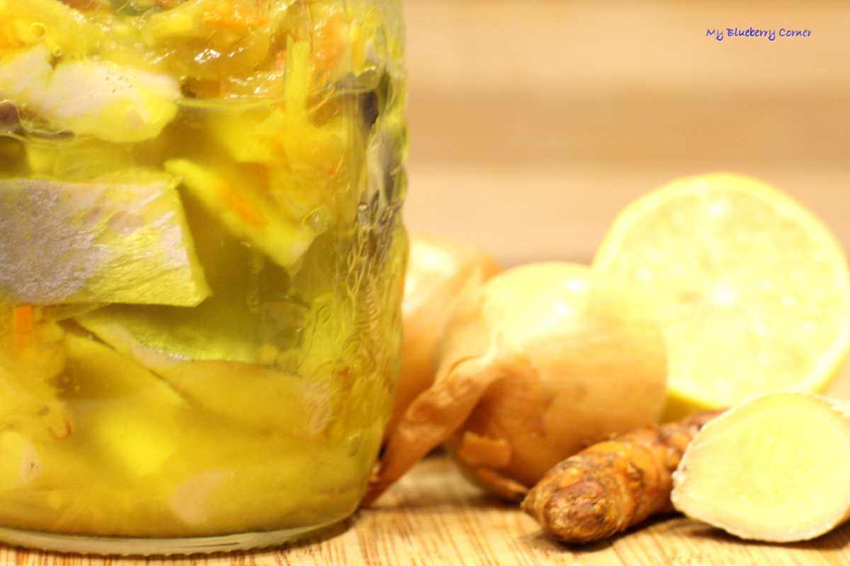 Wczoraj spędziłam przemiły „wieczór wigilijny” w gronie najbliższych przyjaciół i mogłam przetestować kurkumowe śledzie z imbirem. Wszyscy byli zachwyceni ciekawym, delikatnym smakiem tej bardzo zdrowej przekąski. Bo śledzik na święta musi być! Na wigilię, imieniny i na prywatkę też! Od jakiegoś czasu kombinuję ze świeżą kurkumą, więc w śledziku też jest. W połączeniu z cebulą i świeżym imbirem smakuje doskonale. Kurkuma oprócz wspaniałych walorów smakowych zawiera kurkuminę – cenny dla zdrowia składnik. Kurkumina ma silne działanie przeciwzapalne, obniża poziom histaminy i przeciwdziała zlepianiu się płytek krwi, co wpływa na poprawę krążenia, jednocześnie chroniąc nas przed arteriosklerozą. Wyciągi z kurkumy stosuje się w zapaleniu dróg żółciowych i pęcherzyka żółciowego. Wiadomo też, że kurkuma chroni komórki wątroby i wspomaga ich regenerację. Pozytywnie wpływa na układ nerwowy i zapobiega depresji, może działać przeciwnowotworowo. W kurkumie jest też jeszcze jeden zdrowy składnik – olejek eteryczny tumeron. Według niemieckich naukowców z Instytutu Medycyny i Neurofizjologii tumeron przyspiesza procesy naprawcze w mózgu (np. po udarze). Eksperymenty wykazały również, że związek ten pobudza nerwowe komórki macierzyste do namnażania. Inni naukowcy z Uniwersytetu Kalifornijskiego w Los Angeles wykazali, że kurkumina pobudza organizm do niszczenia białek winnych choroby Alzheimera.