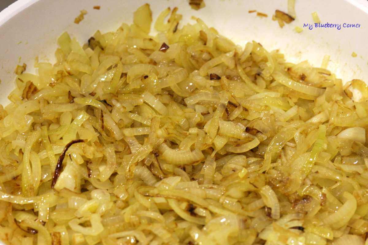 Na patelnię dodać 1-2 łyżki oleju i na tym smażyć cebulę, aż ta zmięknie i zrobi się rumiana.