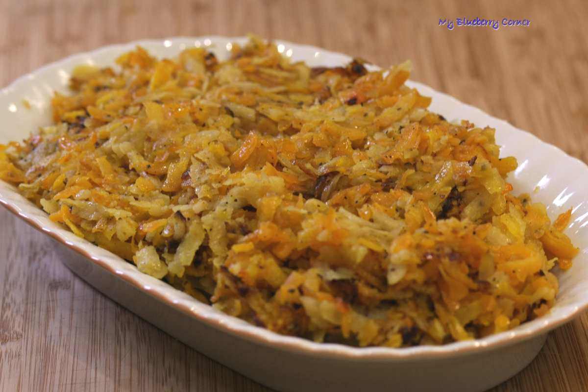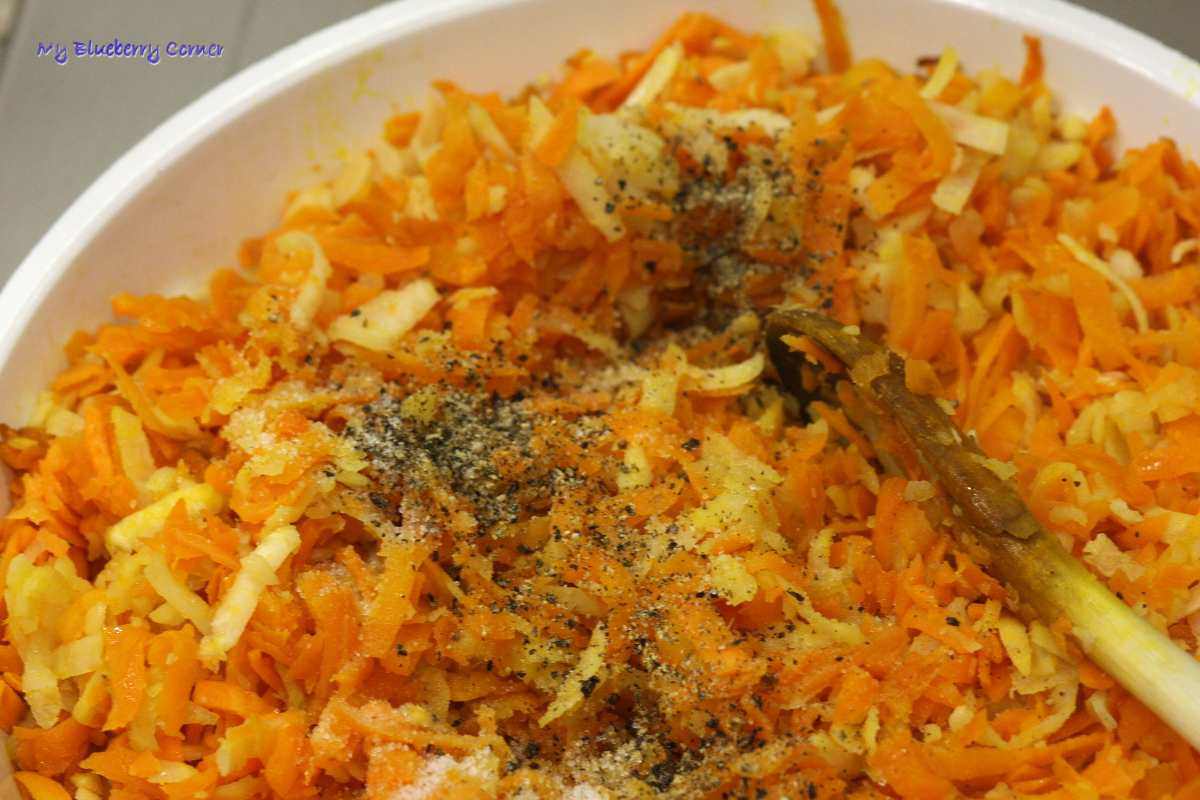 Usmażoną cebulę przełożyć (najlepiej cedzakiem, żeby odsączyć nadmiar tłuszczu) na rybę. Na patelnię znów dodać 1-2 łyżki oleju. Na tym smażyć marchewkę i pietruszkę przyprawione solą i pieprzem aż zrobią się miękkie.