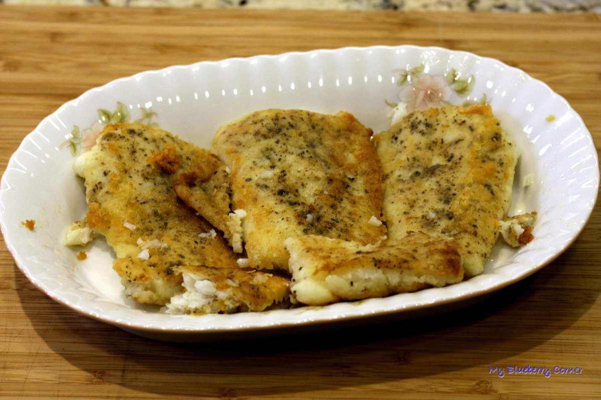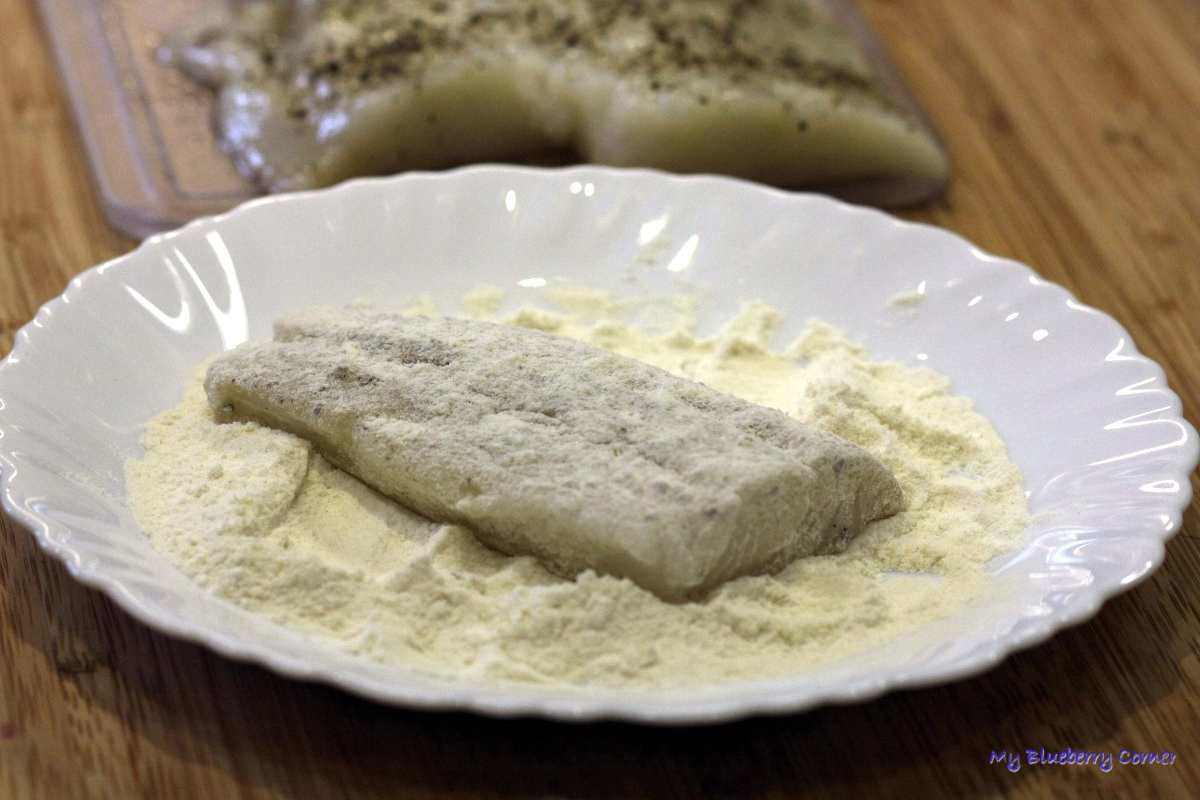 Na patelni rozgrzać ok. 2 łyżki oleju rzepakowego. Tuż przed smażeniem panierować filety w mące wysypanej na talerzu.