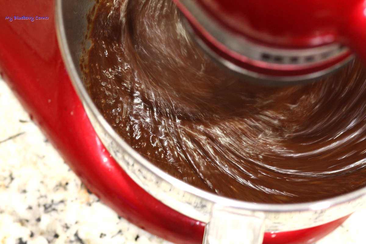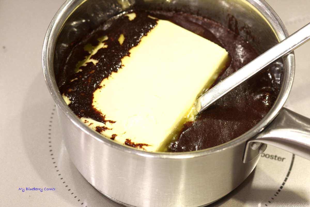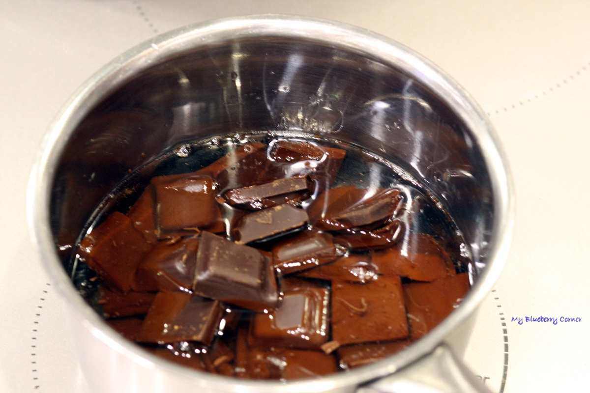 Piekarnik rozgrzać do 180°C. Zagotować wodę z cukrem. Do tego dodać połamaną na kawałki czekoladę, a po 2 – 3 minutach dodać masło.