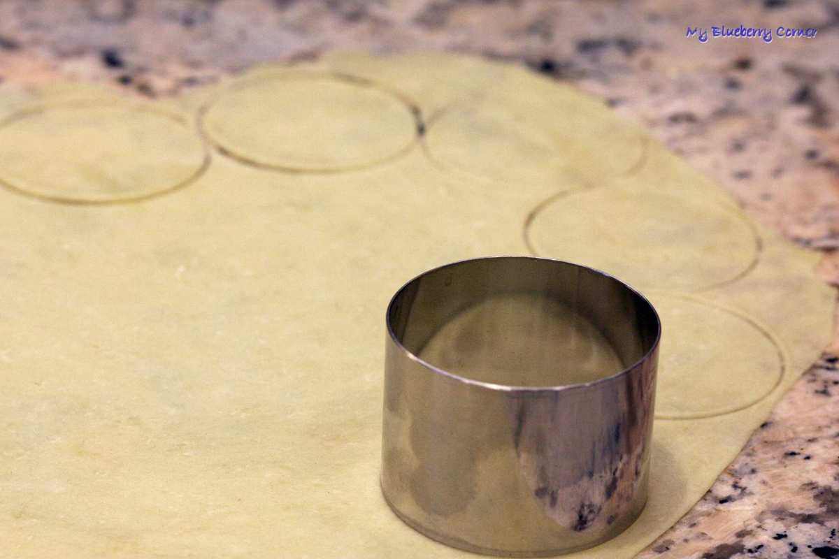 Ciasto podzielić na 4 kawałki. Każdy kawałek cienko rozwałkować, wykrawać kółka o średnicy 6 cm.