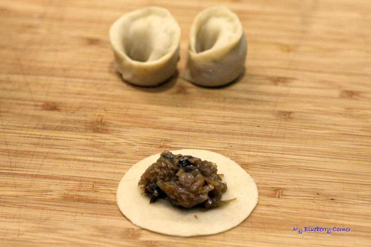 Na każdym kawałku, na środku położyć ok. 1 łyżeczkę farszu, brzegi zlepić jak pierogi.