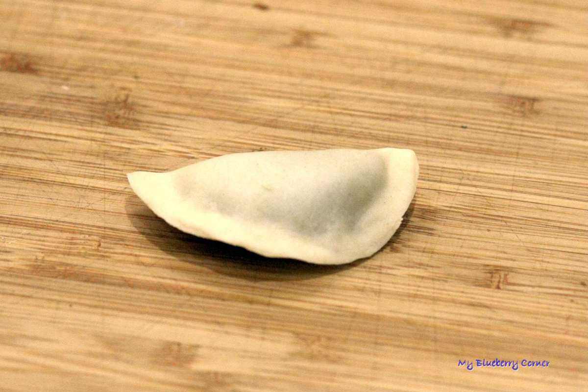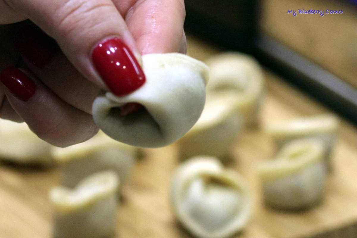 Sklejone pierożki owijać wkoło wskazującego palca i kciukiem sklejać rogi.