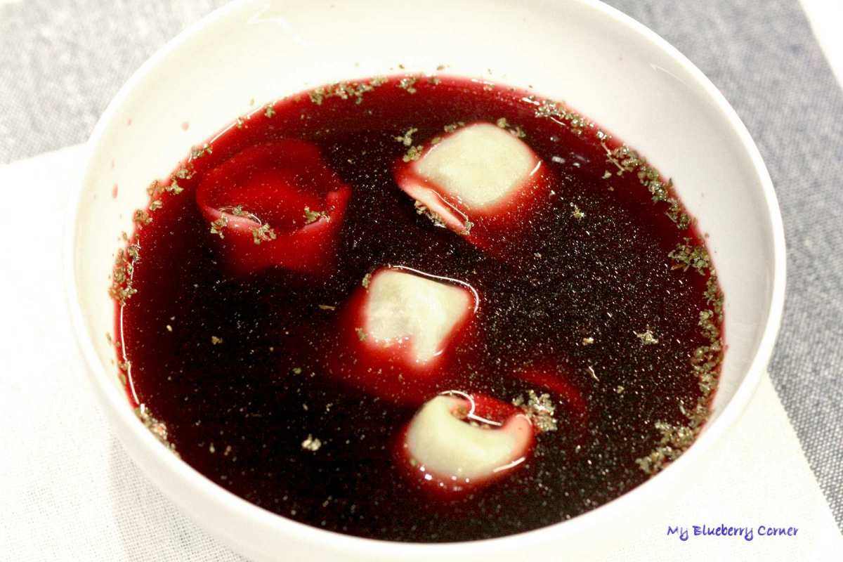 Uszka z kapustą i grzybami podawać na gorąco z czerwonym barszczem.