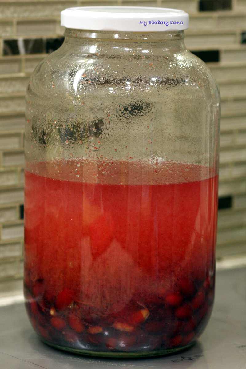 Odstawić na 4 – 6 tygodni w ciepłe miejsce. Co kilka dni wstrząsnąć zawartością słoja. Po tym czasie zlać nalewkę. Owoce zasypać cukrem, słój zakręcić i odstawić w ciepłe miejsce na kilka dni, co jakiś czas wstrząsać aż cały cukier się rozpuści. Całość wraz z sokiem przelać przez gęste sito.
